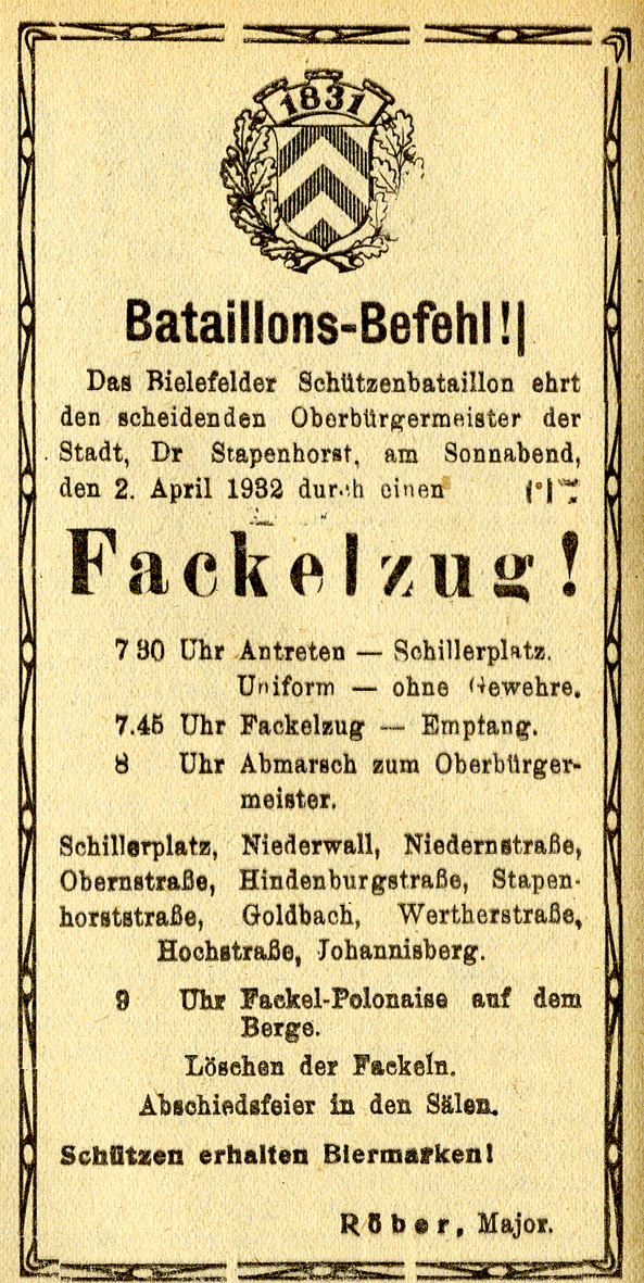 Am 31. März 1932 endete mit dem Rücktritt von Dr. Rudolf Stapenhorst (1865-1944) die längste Amtsperiode eines Bürgermeisters in der Geschichte Bielefelds. Als frisch promovierter Jurist wurde er im Mai 1895 zum zweiten Bürgermeister gewählt und wenige Monate später von Oberbürgermeister Gerhard Bunnemann in sein Amt eingeführt. Stapenhorst war zu diesem Zeitpunkt erst 30 Jahre alt und hatte nach der Promotion nur wenige Monate bei der preußischen Regierungsbehörde in Minden und als Vertreter des Landrates in Büren seine ersten Sporen verdient. In Bielefeld zeichnete er mit dem Polizei- und Schulwesen zunächst für einen „verhältnismäßig klein umschriebenen Aufgabenbereich” verantwortlich, wie die Westfälische Zeitung rückblickend berichtete.