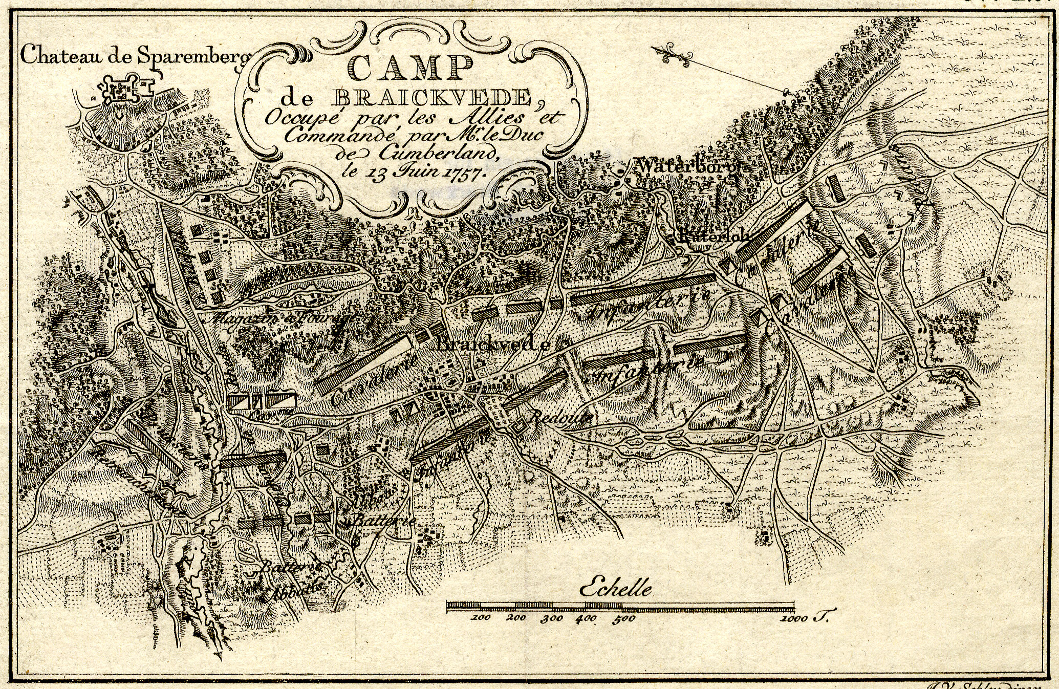 Unter dem Befehl von Marschall Louis Charles César Le Tellier Comte d´Estrées (1695-1771) verließ der durch österreichische Kontingente auf 115.000 Mann verstärkte Gegner im April 1757 den niederrheinischen Raum. Der alliierte Kommandeur William Augustus Duke of Cumberland (1721-1765) zog daraufhin seine Truppen im Raum Bielefeld-Paderborn zusammen: Eine Hälfte der Armee lag mit dem Hauptquartier bei Paderborn, die andere ab dem 2. Mai 1757 auf der Schildescher Heide nördlich von Bielefeld. Zwei preußische Regimenter aus der aufgegebenen Festung Wesel zogen in Bielefeld ein. Am 19. Mai 1757 bezogen 14 Bataillone Hannoveraner und Braunschweiger das Lager Brackwede, das bald darauf weitere Truppen aufnahm. Der rechte Flügel stand bei Bielefeld, der linke südlich vor dem Höhenzug von Steinhagen über Quelle, den Blömkenberg und die Kupferheide sowie nördlich Brackwedes bis nach Senne II, die Kavallerie kampierte südlich von Brackwede.