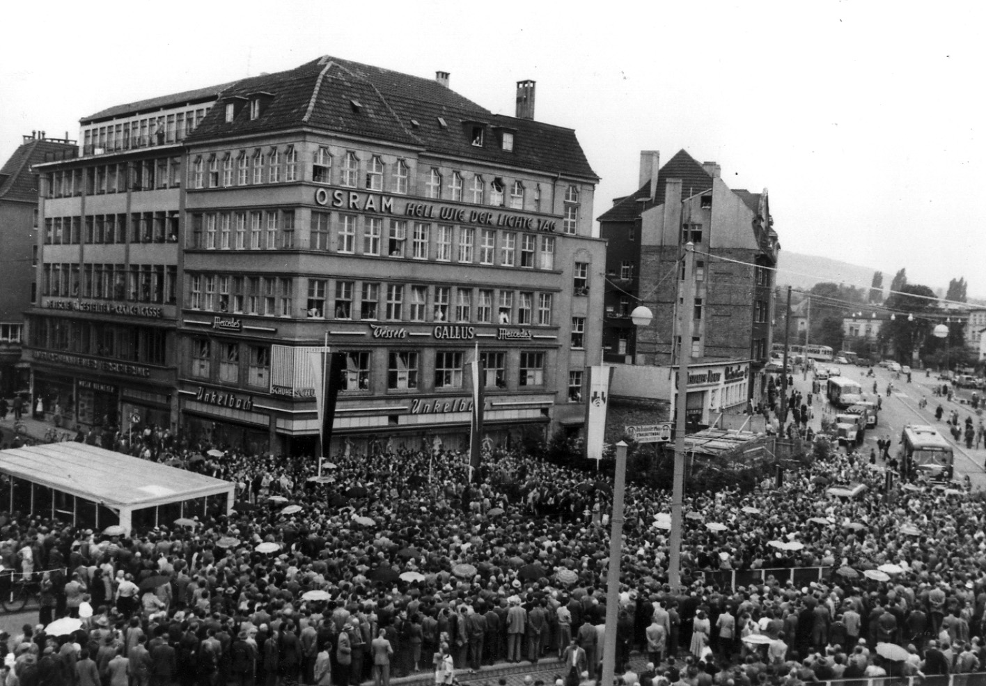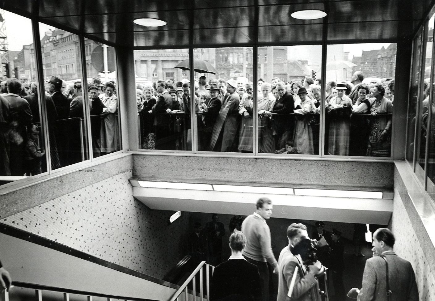 Am 19. Juli 1957 pilgerten seit den frühen Morgenstunden Tausende von Menschen zum Jahnplatz. Stunden bevor Oberbürgermeister Artur Ladebeck den umgestalteten Platz und vor allem den Fußgängertunnel in einem Festakt freigab, standen die Menschen dichtgedrängt an der mit Fahnen und Zweigen geschmückten Tribüne an der Niedernstraße Ecke Niedernwall. Kein Bein konnte man an die Erde bekommen, als Ladebeck das rot-weiße Band durchschnitt, das einen Tunneleingang versperrte. Und dann gab es kein Halten mehr: Den ganzen Tag, es war ein Freitag, strömten Menschenmassen durch den Tunnel, bildeten sich Schlangen an den Rolltreppen. „Jeder wollte einmal ganz umsonst in die Erde und wieder hinauf fahren“, berichtete die Freie Presse. Auch ein Kameramann des Deutschen Fernsehens versuchte über die Köpfe hinweg Bilder einzufangen, die abends in der Tagesschau gezeigt wurden. Der Menschenandrang hielt auch am Wochenende an: Wiederum schritten Tausende durch den Tunnel und genossen auf den Rolltreppen die Fahrt ins unterirdische Bielefeld und zurück ans Tageslicht.