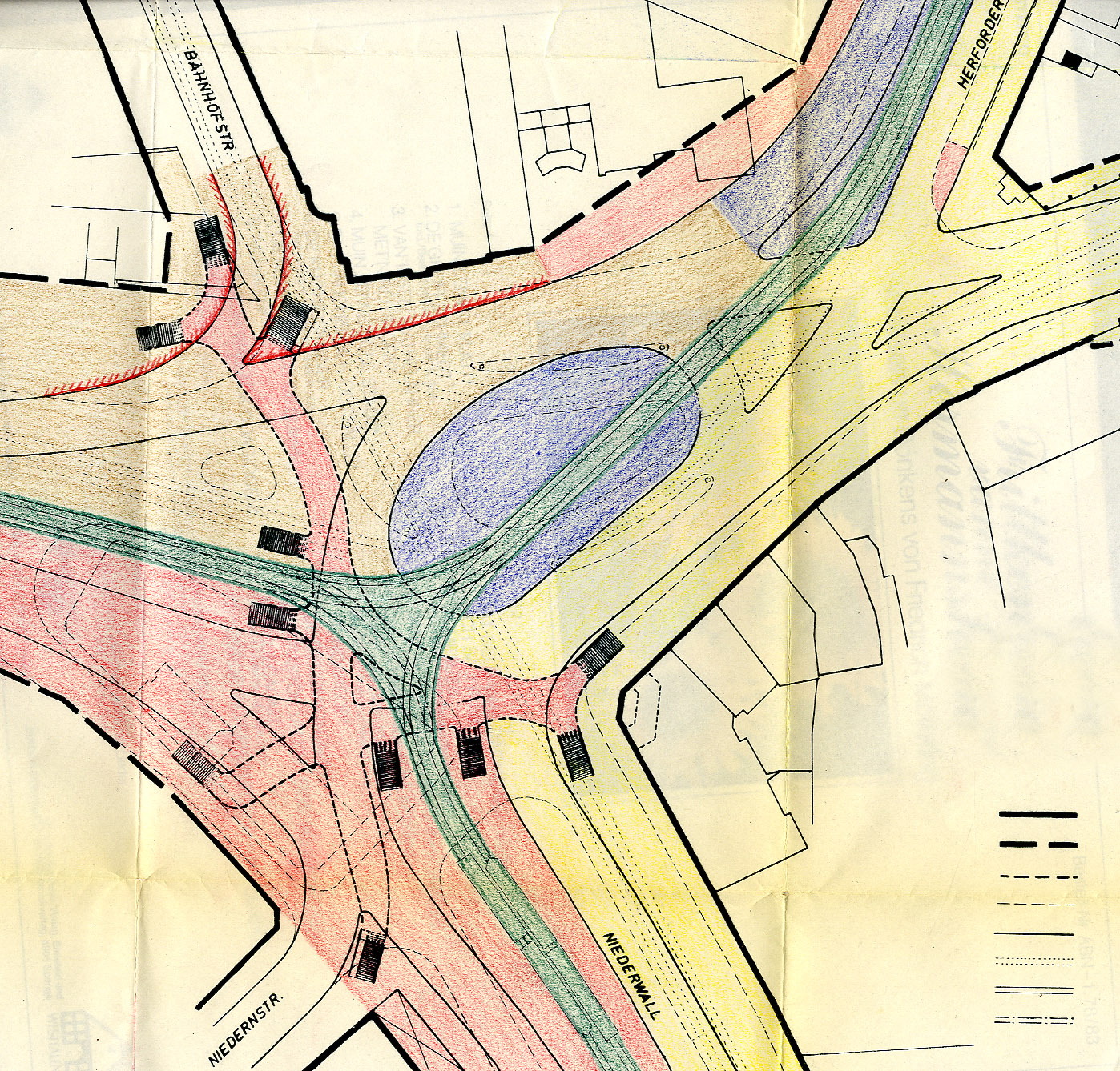 Für Hugo Oblau, Leiter des städtischen Straßenverkehrsamtes, bildete der Jahnplatz einen „Hauptknotenpunkt“, der aufgrund der „starken Zusammenballung des Verkehrs“ zu Stauungen führen musste. Daher gehörte zwar der Umbau des Platzes zur vordringlichsten Maßnahme, die aber notwendigerweise den Ausbau der zuführenden Straßen nach sich ziehen müsste, um „den Abfluss des Straßenverkehrs“ zu gewährleisten. Alle „Knotenpunkte“ auf der Alfred-Bozi- und Herforder Straße müssten beseitigt und mit „synchronisierten Signalanlagen“ versehen werden. Nach Oblau konnte nur dadurch „der erforderliche Synchronismus gewahrt werden, der einen wirklich reibungslosen Fließverkehr sichert.“ Überdies bezeichnete er es als einen „Irrtum zu glauben, daß durch eine zeitgemäße Neugestaltung des Knotenpunktes Jahnplatz die Verkehrskalamität in Bielefeld behoben wird.“ Zur Entlastung der Innenstadt brauche Bielefeld letztlich eine Umgehungsstraße, wie sie mit der Trasse längs der Eisenbahn geplant sei.