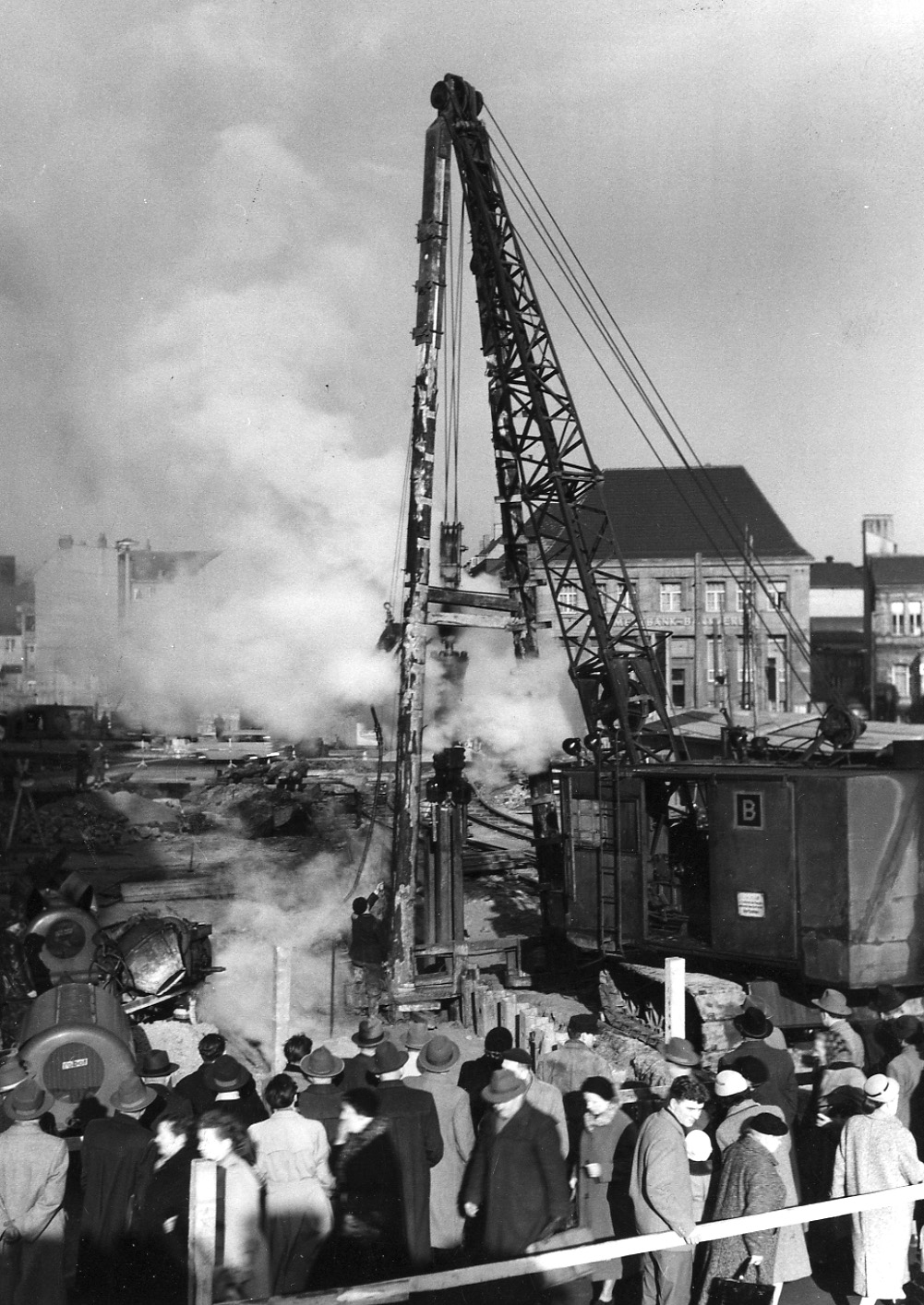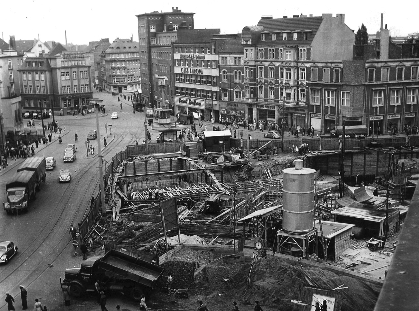 Im Mai 1956 begannen die Umbauarbeiten des Jahnplatzes zur „Verkehrsspinne“, wie Feuchtinger den Umbau bezeichnet hatte. Sie forderten von Verkehrsteilnehmern, Fußgängern und nicht zuletzt vom Einzelhandel und Geschäftsleuten ein Höchstmaß an Geduld und Toleranz. Der Platz wurde kratertief aufgerissen, legte Kanäle frei, die neu verlegt werden mussten. An vielen Stellen versperrten meterhohe Bauzäune den Blick auf Bielefelds größte Baustelle oder den gewohnten Weg über den Platz. Und überall war der Lärm von Dampframmen zu hören, die unzählige Spundwände einsetzten. Obwohl von den Menschen viel abverlangt wurde, gab es kaum Klagen. Es überwog vielmehr die Neugier, durch Bretterzäune zu schauen oder barrierefreie Plätze zu suchen, um einen Blick auf die Baustelle zu erhaschen. Und der wöchentliche „Jahnplatzbummel“, der über die Baufortschritte informieren sollte, gehörte zum massenhaften Freizeitvergnügen.