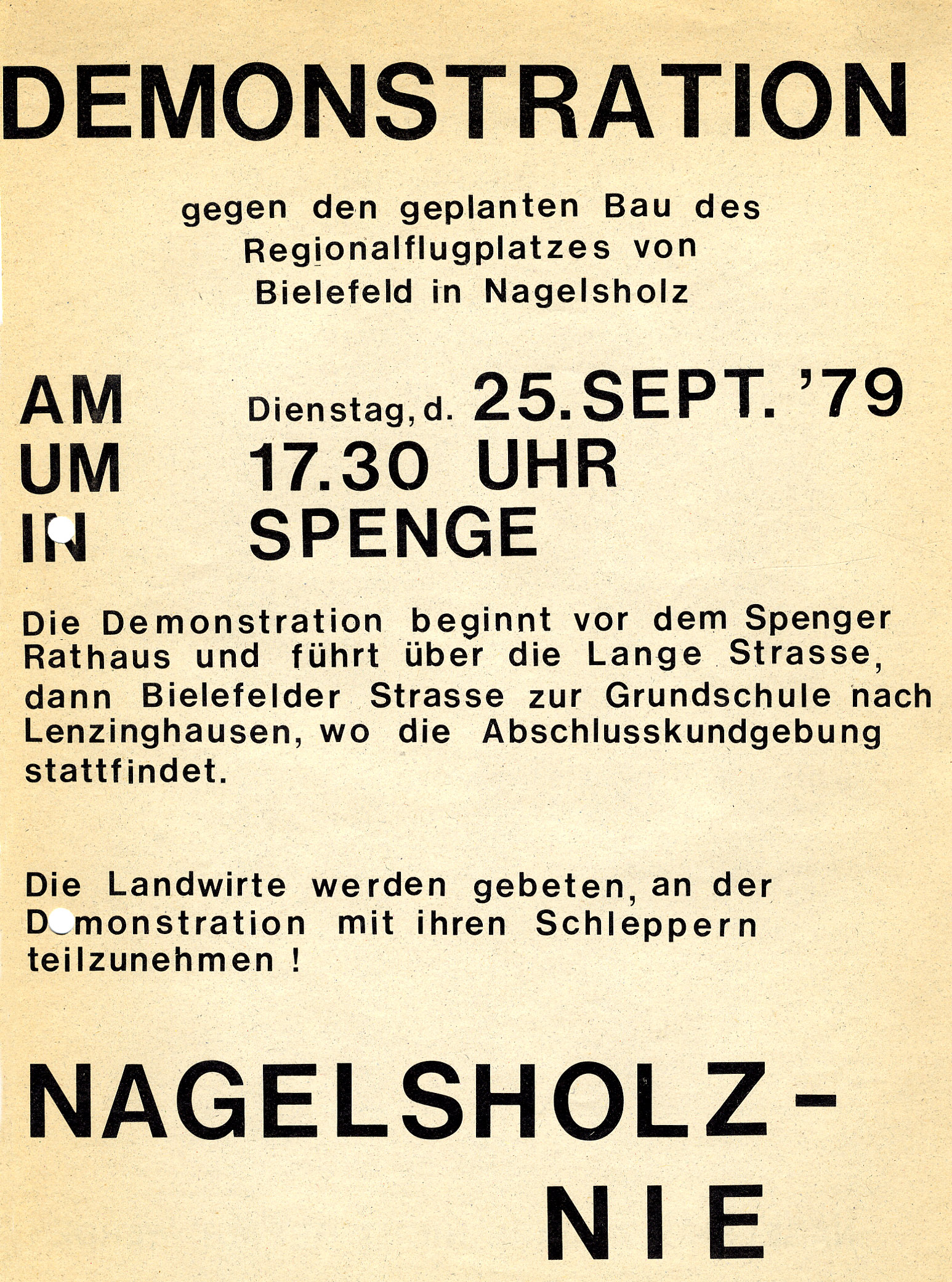 Die Stimmung war gekippt. Ging es 1963 eigentlich nur um den Standort eines Regionalflughafens Ostwestfalen-Lippe, so protestierten nun Tausende gegen ein Projekt, das anscheinend nicht mehr in eine Zeit passte, in der Bürgerinitiativen sich gründeten, um sich an kommunaler Politik zu beteiligen, und ein sich allmählich herausbildendes ökologisches Bewusstsein die Wertmaßstäbe der gesamten Gesellschaft veränderte. Im März 1980 stellte das Land die Unterstützung für den Flughafen Nagelsholz ein. In der schriftlichen Begründung hieß es, dass die Genehmigung des Planfeststellungsverfahrens von 1970 wegen der fehlenden Erforderlichkeit eines Regionalflughafens nach Abwägung der Interessen aller Beteiligten wieder zurückgenommen werden müsse.