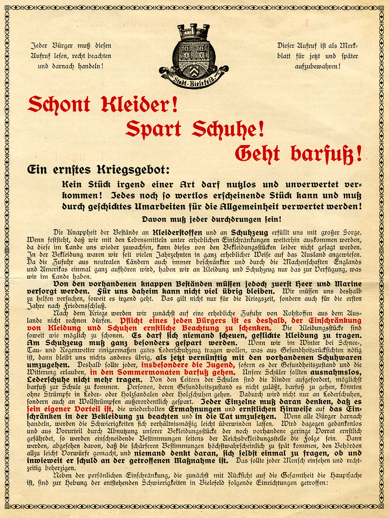 1917 wandte sich der Bielefelder Aufruf zur 7. Kriegsanleihe auch an Jugendliche: „Mehr denn je gilt es, unseren zahlreichen Gegnern zu zeigen, daß es bei uns in der Heimat mit dem Durchhalten ebenso unerschütterlich Ernst ist, wie bei unseren tapferen Kriegern mit dem Standhalten an der Front. Auch Du, Bielefelder Jungmann, mußt mitkämpfen an Deinem Platz und nach Deinen Kräften. Mitarbeiten, sparen, zeichnen! das ist Deine Aufgabe. Fehlen darf keiner dabei.” Auf die Frage, wie ein Jugendlicher mithelfen könne, hieß es unmissverständlich: „Du sollst Eltern und Geschwister, Verwandte, Freunde und Bekannte bitten und wieder bitten, den Ruf des Vaterlandes nicht unerhört zu lassen”. Die Appelle fielen auf fruchtbarem Boden. Sämtliche Kriegsanleihen wurden von breiten Bevölkerungsschichten gezeichnet. Auf den Listen fanden sich Arbeiter, Handwerker, Firmenbesitzer und selbst ganze Klassenverbände der höheren Schulen. Schülerinnen und Schüler nahmen zudem an den regelmäßigen Sammelaktionen teil. Gesammelt wurde alles, was die heimische Wirtschaft entlastete: Altmetalle, Leder, Textilien, immer wieder Gold, aber auch Bucheckern, die zu Öl gepresst werden sollten.