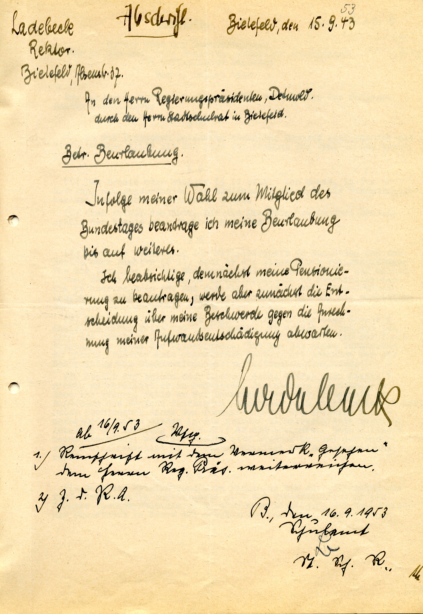 „Die Überraschung der gestrigen Ratssitzung: Ladebeck erhielt eine Stimme mehr”, informierte die Westfälische Zeitung am 24. November 1954 über die Wahl des Bielefelder Oberbürgermeisters nach der ersten Hälfte der Legislaturperiode. Artur Ladebeck kehrte auf den Posten des Oberbürgermeisters zurück. Eine Veränderung der Wahlgesetze machte das möglich. Bis 1961 sollte er dieses Amt innehaben. „In einer würdigen Feier ehrten gestern um die Mittagsstunde Mitglieder des alten Rates den endgültig aus der politischen Wirksamkeit scheidenden Oberbürgermeister Artur Ladebeck […]. Ein wertvolles Gemälde von Kunstmaler Heiner war ein kleines Zeichen äußerer Anerkennung des Rates für seinen langjährigen ‚Ober’. Von den Fraktionen gab es rot-weiße Nelkensträuße für den Geehrten. […] Kurz, aber eindrucksvoll, waren die Dankesworte von Oberbürgermeister Ladebeck für die Ehrung, sie klangen aus in der Mahnung: ‚Achten Sie alle stets darauf, daß die Gemeindefreiheit gewahrt wird!’”, mit diesen Worten berichtete am 20. März 1961 die „Freie Presse” von der Verabschiedung. Es war gleichzeitig ein Abtreten von der politischen Bühne.