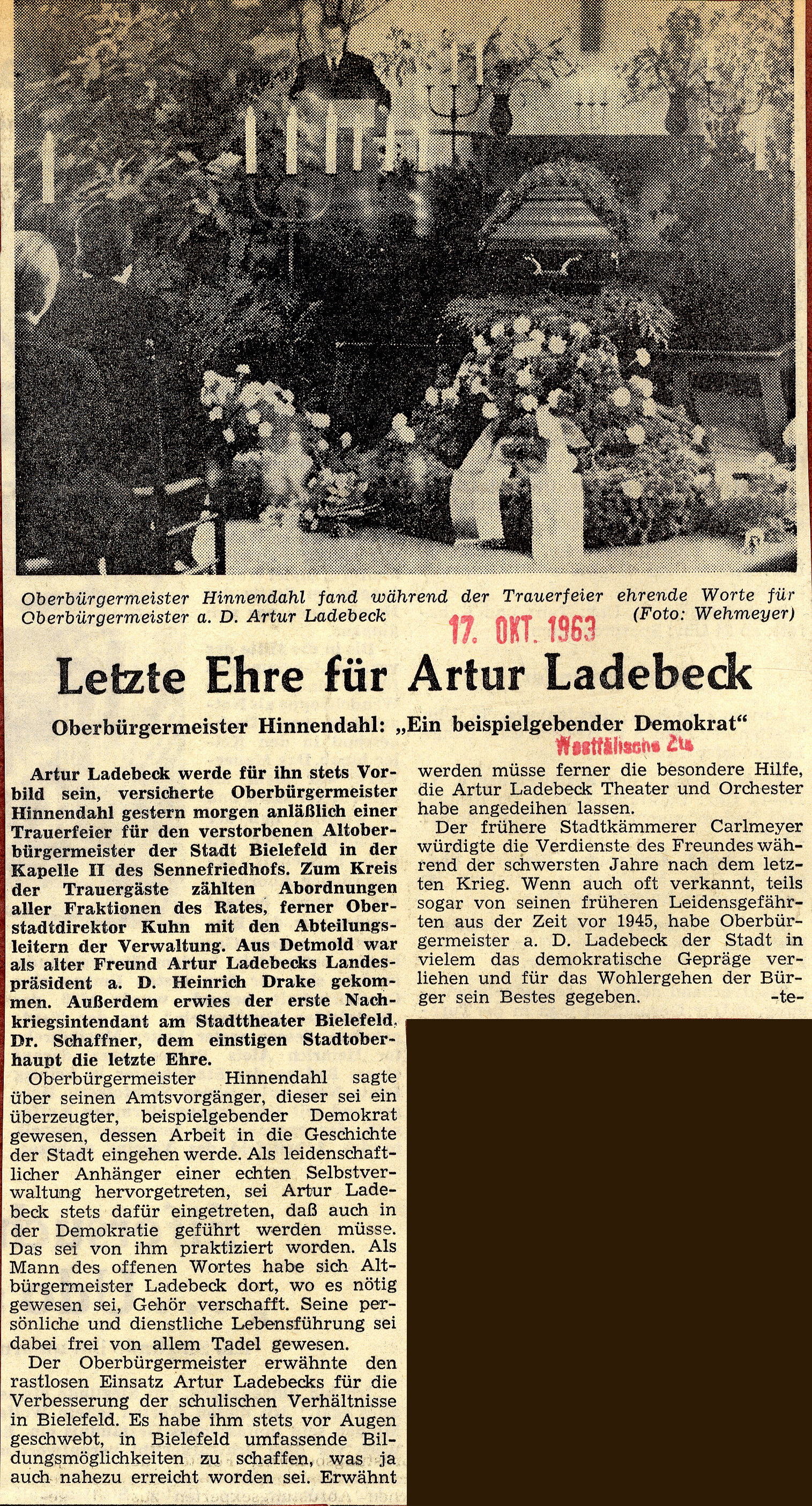 „Der Bezirk Ostwestfalen-Lippe und der Kreisverein Bielefeld-Stadt der Sozialdemokratischen Partei Deutschlands geben in tiefer Trauer bekannt, daß unser Freund, der ehemalige Oberbürgermeister der Stadt Bielefeld Artur Ladebeck nach langem, schweren Leiden verschieden ist. Seine großen Verdienste als Oberbürgermeister der Stadt Bielefeld in den schweren Aufbaujahren nach dem Kriege werden unvergeßlich bleiben. Nachdem er schon vor mehr als drei Jahrzehnten in Bielefeld als Stadtverordneter tätig war, hat er nach 1945 seine ganze Kraft dem Wiederaufbau der zerstörten Stadt Bielefeld gewidmet.” Diese Worte fanden für den SPD-Verband Ostwestfalen-Lippe Emil Gross und für den SPD-Kreisverein Bielefeld-Stadt Dr. Gerhard Koch, beide enge Weggefährten Ladebecks, in der Traueranzeige der Bielefelder Tageszeitung „Freie Presse” vom 14. Oktober 1963.