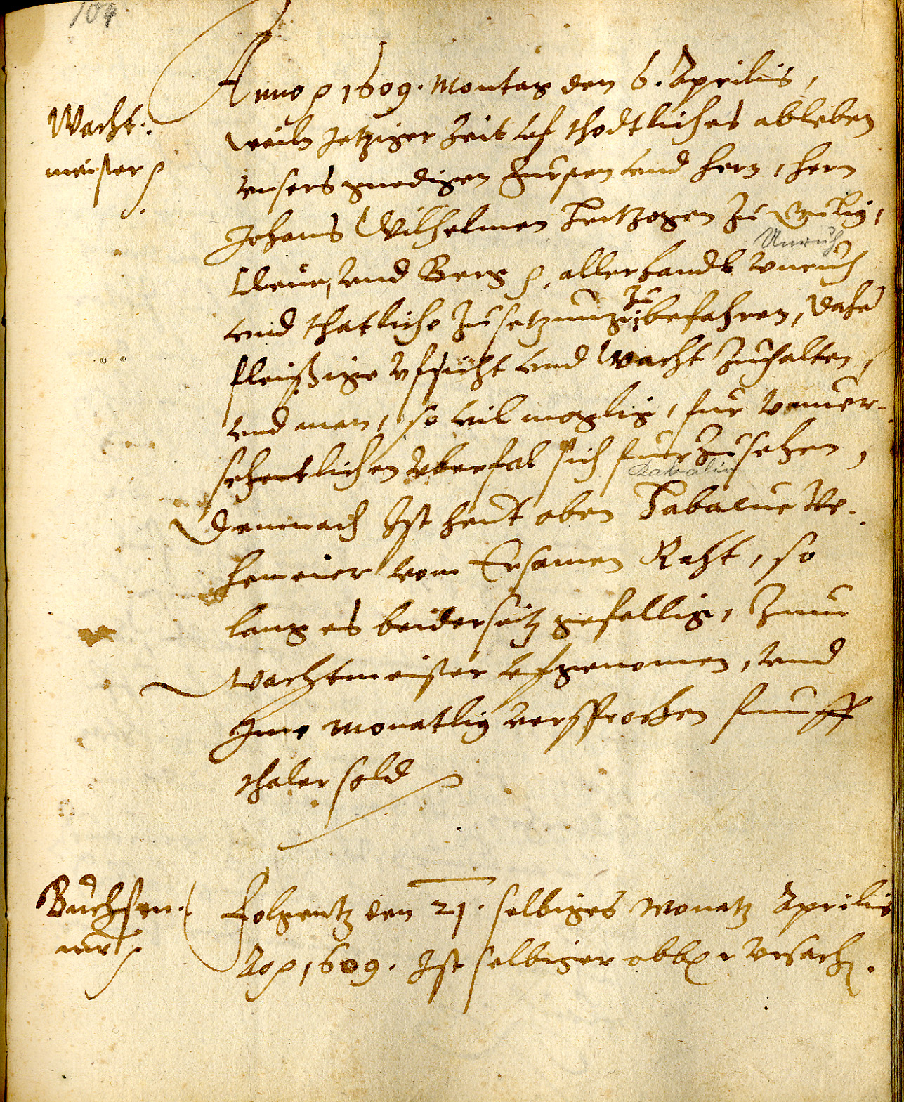 Am 21. April 1609 folgte die Anstellung von Adam Busch aus Ahlen als Geschützmeister („Buchsenmeister“), der sich für zwei Monate verpflichtete, auf Anforderung mit seinem Sohn Peter nach Bielefeld zu kommen, um beim „groben geschutz“ Dienst zu tun. Für diesen Bereitschaftsdienst erhielt er zunächst 5 Reichstaler monatlich als „wartgelt“. Falls er zur Beaufsichtigung des Bielefelder Geschützparks einberufen werden sollte, wollten beide Seiten die Besoldung erneut verhandeln.