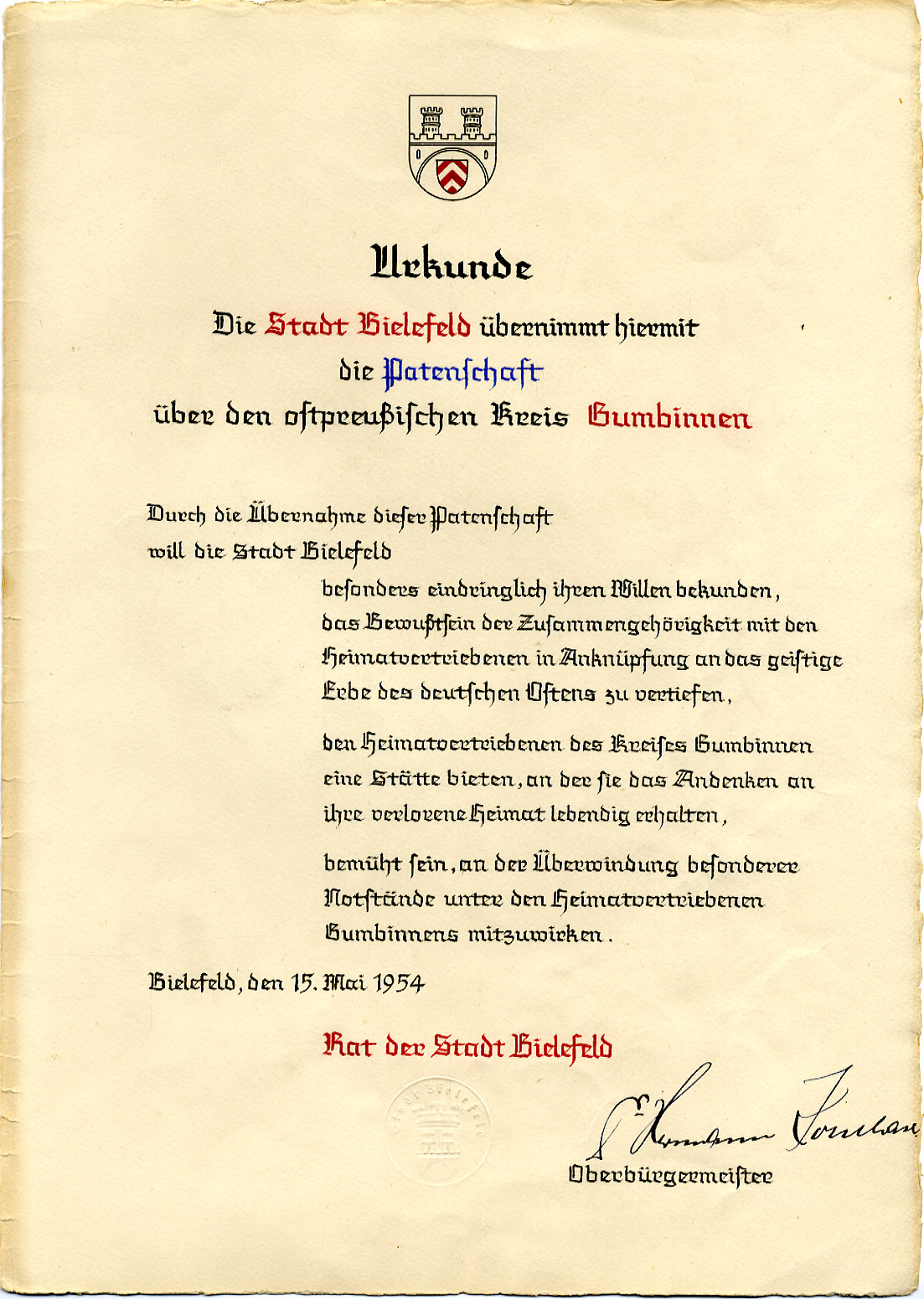 - Stadtarchiv Bielefeld, Bestand 270,10/Kreisarchiv Gumbinnen: Patenschaftsurkunde Bielefeld-Gumbinnen (1954)