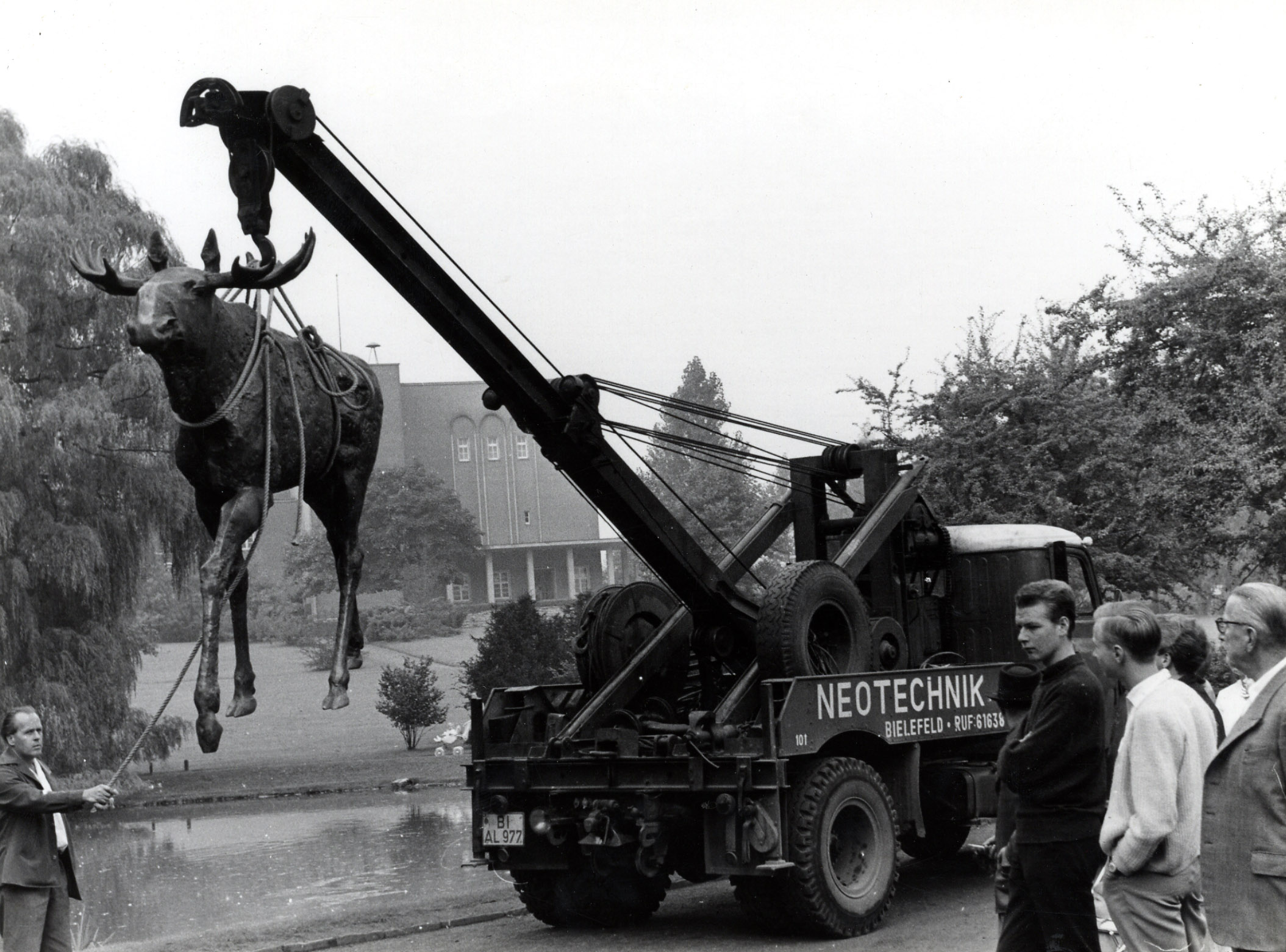 Eine weithin sichtbare Erinnerung an den ehemaligen Kreis Gumbinnen schreitet seit 1961 durch den Bürgerpark: Der „Gumbinner Elch”. Eine erste Initiative für dieses Denkmal startete im Januar 1958 Dr. Wilhelm Niemeyer vom Bielefelder Vertriebenenamt, das die Patenschaft Bielefelds über Gumbinnen verwaltete. Die Finanzierung des Monuments wurde u.a. durch einen „Elchgroschen” gesichert, den die Kreisgemeinschaft seit Mitte 1958 sammelte. Verschiedene Standorte wurden vorgeschlagen, so an der Obernstraße bei der Bavink-Schule, bei der Jungenberufsschule an der Heeper Straße oder bei der Mädchenberufsschule an der Huberstraße. Der Vertriebenenausschuss plädierte für den Heimat-Tierpark Olderdissen, der Rat wollte dem in einer nur 26minütigen Sitzung jedoch nicht folgen, schließlich sollte das Standbild „keine zoologische, sondern eine politische Funktion erfüllen”, wie die Freie Presse am 25. Februar 1960 berichtete. Am 26. Februar 1960 brachte ein mit „H.K.” (Hans Kuntze?) gezeichneter Leserbrief im Westfalen-Blatt den Bürgerpark in die Diskussion. Nachdem eine liegende Darstellung des Elches verworfen wurde („Nur tote Elche legen sich”), konnte das vom Bildhauer Prof. Hans Ruwoldt aus Hamburg gefertigte, 600 Kilogramm schwere Bronzedenkmal am 24. September 1961 eingeweiht werden. Seitdem wird der lebensgroße Elch bei den Gumbinner Heimattreffen in Bielefeld immer wieder aufgesucht.