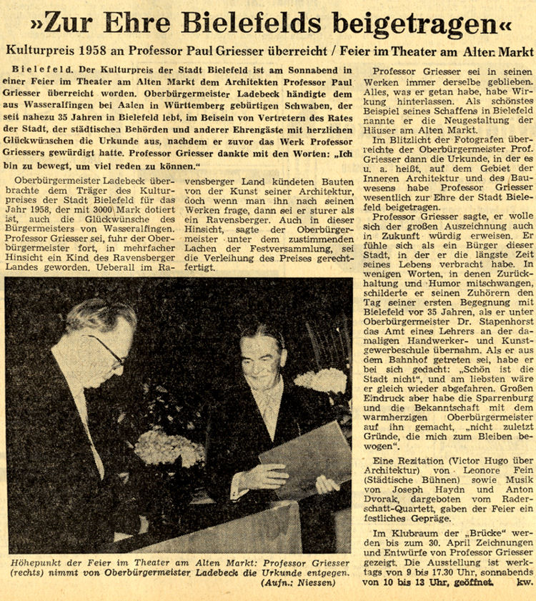 Im April 1959 wurde Paul Griesser mit dem Kulturpreis 1958 der Stadt Bielefeld ausgezeichnet. Feierlich wurde ihm der Preis von Arthur Ladebeck, Bielefelder Oberbürgermeister, im Theater am Alten Markt überreicht. „Professor Griesser sagt, er wolle sich der großen Auszeichnung auch in Zukunft würdig erweisen. Er fühle sich als ein Bürger dieser Stadt, in der er die längste Zeit seines Lebens verbracht habe. In wenigen Worten, in denen Zurückhaltung und Humor mitschwangen, schilderte er seinen Zuhörern den Tag seiner ersten Begegnung mit Bielefeld vor 35 Jahren, als er unter Oberbürgermeister Dr. Stapenhorst das Amt eines Lehrers an der damaligen Handwerker- und Kunstgewerbeschule übernahm. Als er aus dem Bahnhof getreten sei, habe er bei sich gedacht: ‚Schön ist die Stadt nicht‘, und am liebsten wäre er sofort wieder abgefahren. Großen Eindruck aber habe die Sparrenburg und die Bekanntschaft mit dem warmherzigen Oberbürgermeister auf ihn gemacht, nicht zuletzt Gründe, die mich zum Bleiben bewogen”, berichtete das Westfalen-Blatt am 20. April 1959.