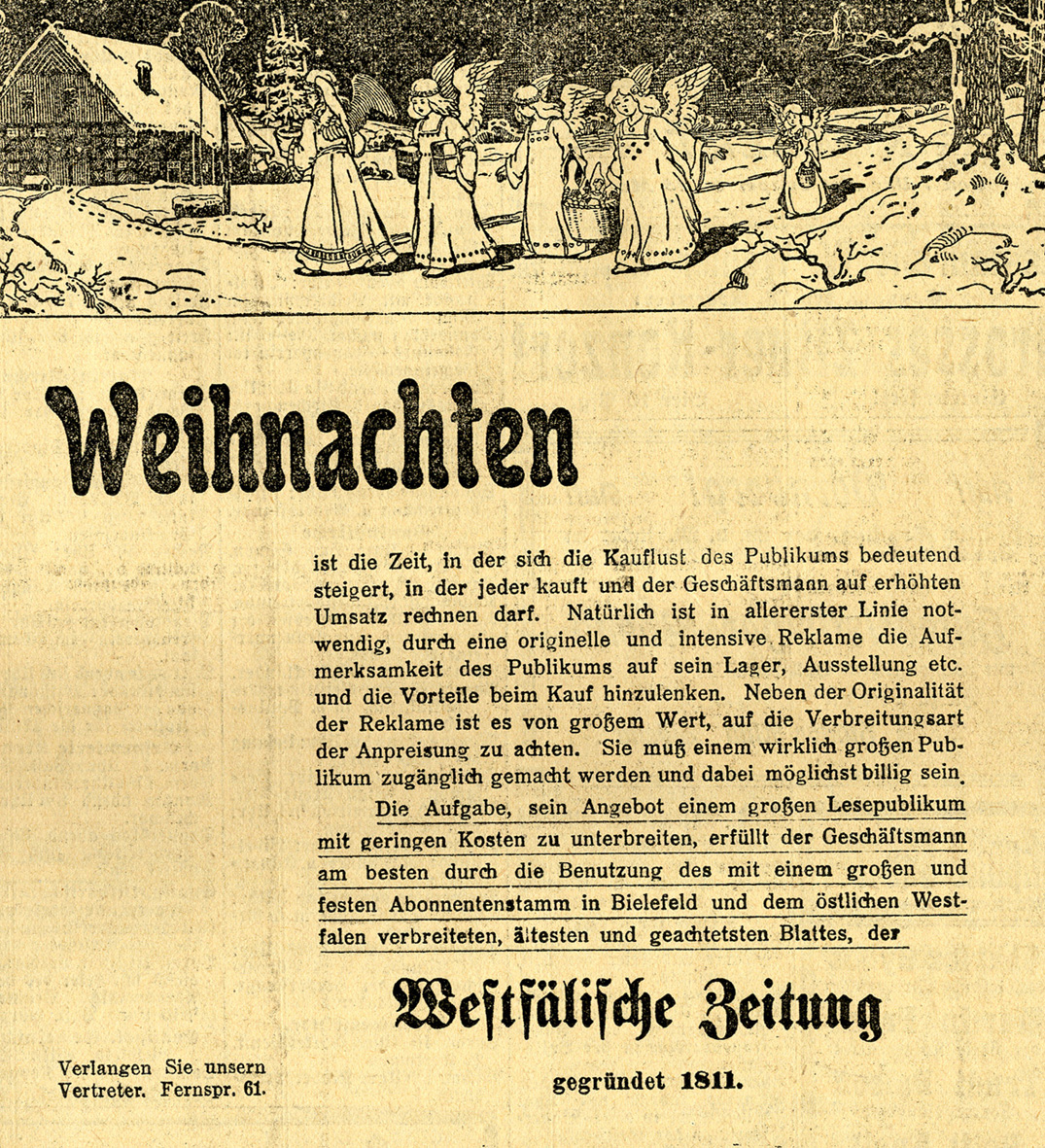 In der ersten Dekade des 20. Jahrhunderts gab es in Bielefeld zwar keine konfessionelle Tageszeitung, mit der Westfälischen Zeitung aber eine konservative, die die Werte einer bürgerlichen, kaisertreuen Gesellschaft auf ihre Fahnen schrieb. Umso mehr mag es aus der Sicht des 21. Jahrhunderts verwundern, dass die „Weihnachtslust”, also durch Konsum das Leuchten in den Augen der Kinder zu erzeugen, vor hundert Jahren bereits als ein wesentlicher Ausdruck des „Weihnachtsernstes”, also der Geburt Jesu, des menschgewordenen Gottessohnes, genannt wurde. Konsum spielte freilich noch nicht die Rolle, die er heute einnimmt. Unbedeutend war Konsum und die ihm vorauseilende Werbung aber nicht. „Weihnachten steht vor der Tür!”, erinnerte am 25. November 1909 die Tageszeitung und sprach dem Einzelhandel ins Gewissen: „Der rührige und auf der Höhe der Zeit stehende Geschäftsmann bietet alles auf, die kurze Spanne gesteigerter Kauflust für sich nach besten Kräften auszunützen. Ein mächtiges Hilfsmittel für diese seine Bestrebungen” sei eine Anzeige, natürlich in der „weit verbreiteten und beliebten” Westfälischen Zeitung. Am Samstag vor dem 1. Advent erinnerte ein mit Engeln geschmücktes Inserat: „Weihnachten ist die Zeit, in der sich die Kauflust des Publikums bedeutend steigert, in der jeder kauft und der Geschäftsmann auf erhöhten Umsatz rechnen darf.” Waren Ökonomen traditionell davon ausgegangen, dass die Nachfrage allein durch die Kaufkraft bestimmt werde, so setzte sich seit dem späten 19. Jahrhundert die Einsicht durch, dass der Wunsch, etwas kaufen zu wollen, die Nachfrage nicht unwesentlich beeinflusst. Und Wünsche, diese Erkenntnis wurde bald zum Allgemeingut, konnten durch gezielte Werbung angeregt werden. So belehrte denn auch die Zeitung, dass „durch eine originelle und intensive Reklame die Aufmerksamkeit des Publikums” gelenkt werden könnte.
