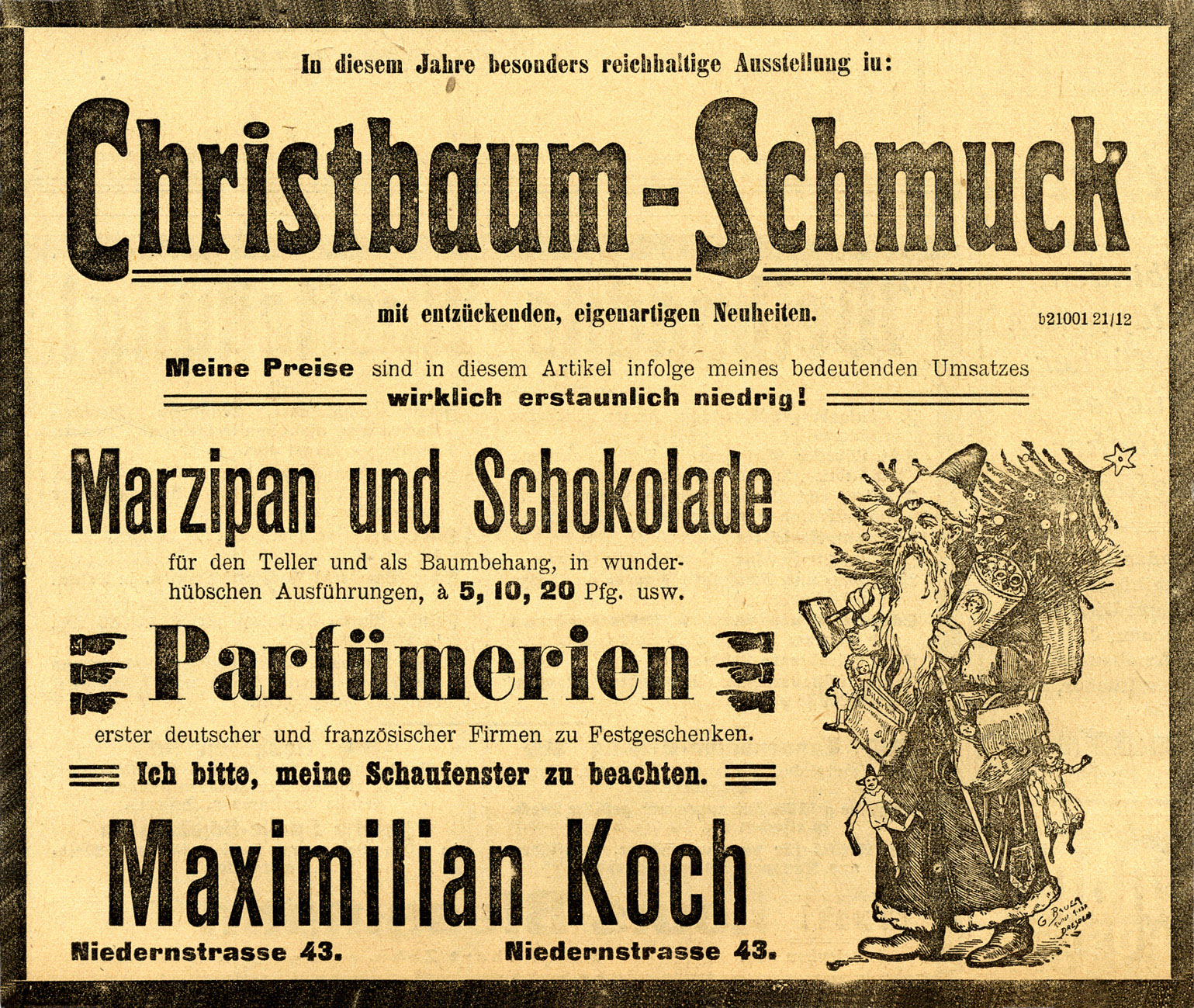 Wesentlich forscher hieß es dann in der ersten Adventwoche: „Wenn Sie von dem Geldstrom, der vor Weihnachten in Bewegung gesetzt wird, sich einen grösseren Anteil sichern wollen, so müssen Sie durch lebhafte Propaganda immer und immer wieder die Aufmerksamkeit der Käufer auf Ihr Geschäft lenken.” Dabei genüge es nicht, „dass man inseriert, sondern auf das ‚wie’ kommt es an.” So sollten Inserate nicht in vielen, sondern nur in einer Zeitung, nämlich der Westfälischen Zeitung, erscheinen. „Konzentration ist der Erfolg unserer Zeit und Zersplitterung schwächt nur.” In der Tat waren in den Bielefelder Tageszeitungen erst wenige Inserate zu finden, die damit warben, das richtige, passende „Festgeschenk” im Angebot zu haben. Das sollte sich mit dem Beginn der Adventszeit ändern.