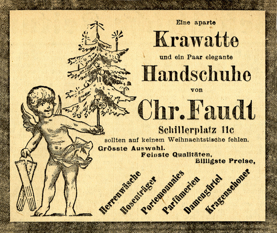 „Stets willkommene Weihnachtsgeschenke” waren für Heinrich Hehner am Gehrenberg Pelzwaren. Louis Voss an der Herforder Straße oder August Hagemeier am Niederwall sprachen sich dagegen für Nähmaschinen aus Bielefelder Produktion aus, die „als vornehmes Weihnachtsgeschenk sehr geeignet” seien. Auch das Schirmgeschäft Hoppe an der Niedernstraße empfahl außer seinen Schirmen vor allem Spazierstöcke „in geschmackvoller, vornehmer Ausführung wie echt Silber”, mit Silbereinlage oder echtem Toledo Schildplatt, mit Elfenbein oder „Rhinozeros”. Die Klassiker unter den Weihnachtsgeschenken, die „aparte Krawatte” für den Herrn und „ein Paar elegante Handschuhe” für die Dame, präsentierte Christian Faudt vom Schillerplatz mit eine Putte, die in einer Hand gekonnt einen Weihnachtsbaum hielt. Die Anzeigen in den Tageszeitungen, die in der Adventszeit nicht selten mehrmals mit gleichen oder wechselnden Angeboten erschienen, vertrauten oft nur auf den reinen Text. Viele waren aber mit Weihnachtsmännern und Engeln, Tannengrün und Kerzen versehen auch für den flüchtigen Leser schnell erkennbar. Um die Anzeigen preiswert drucken zu können, hielten die Zeitungen verschiedene geschützte Klischees bereit.