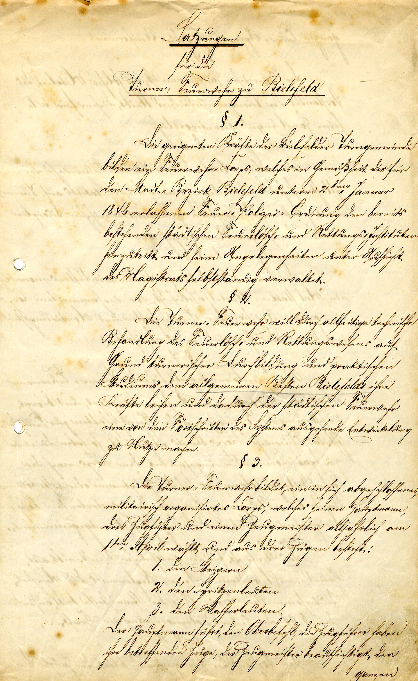 Die Hauptversammlung der Bielefelder Turngemeinde sah am 4. Januar 1860 nur zwei Tagesordnungspunkte vor: Zum einen diskutierten die Sportler über den Bau einer Winterturnhalle, die in der Nähe des Kesselbrinks errichtet werden sollte, zum anderen empfahl der Vorstand den Mitgliedern, eine Turner-Feuerwehr zu gründen und einer entsprechenden Satzung zuzustimmen. Die Versammlung folgte der Empfehlung, und so konnte sich der Vorstand am 9. Januar 1860 mit der Bitte an den Magistrat wenden, die Satzung „zu concessioniren und das Streben der Gemeinde, ihre Kräfte auf gemeinnütziger Weise der Stadt Bielefeld nutzbar zu machen, nach Möglichkeit fördern zu wollen.”