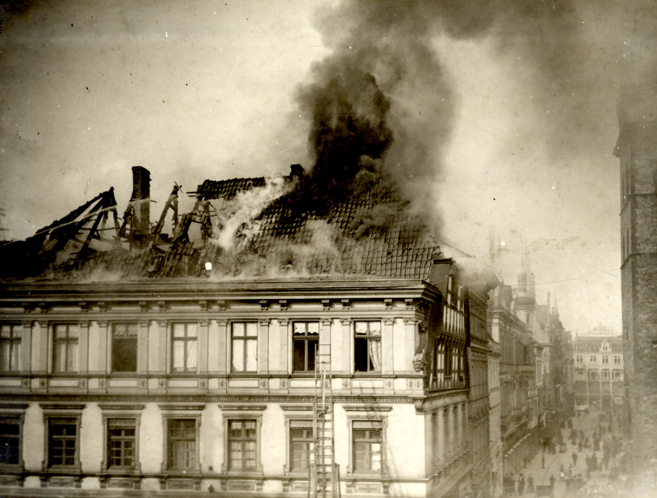 Am 19. Oktober 1879 brach in den frühen Morgenstunden im Maschinenraum der Pianofabrik von Theophil Mann am Oberntorwall ein Feuer aus, dessen Bekämpfung sich außerordentlich schwierig gestaltete. Die Räume waren stark verraucht und zudem schwer zugänglich. Die Steigerkorps mussten zunächst „die Hindernisse beseitigen”, bevor die Spritzen zum Einsatz kommen konnten. Als das Feuer im unteren Teil des Gebäudes gelöscht war, fing es im Obergeschoss wieder an zu brennen, weil die Flammen über die Treibriemen der Maschinen, „welche zur Sicherheit der Arbeiter mit einem Holzgehäuse versehen waren, nach dem mittleren und oberen Stockwerke” übergriffen. Auch hier zerstörte der Brand die Fabrik und das Lager mit „den schönsten neuen Pianinos”, die nun „in hellen Flammen” standen. Dessen ungeachtet, lobte wiederum das Bielefelder Tageblatt: „Den Leistungen der Turnerfeuerwehr und nicht minder denen der städtischen Rettercompagnie können wir zu unserer Freude in jeder Beziehung das höchste Lob spenden, ja, einzelne Leitungen verdienten, öffentlich bekannt gemacht zu werden.” So gelang es den Feuerwehren, dass der Brand nicht auf andere Gebäude übergriff. Auch bei der Pianofabrik war der Schaden durch eine Feuerversicherung gedeckt, und so hoffte die Zeitung, dass „es den Bemühungen der Inhaber der Fabrik bald gelingen” werde, „provisorische Geschäftsräume zu miethen, um den Arbeitern wieder Verdienst zu geben”.