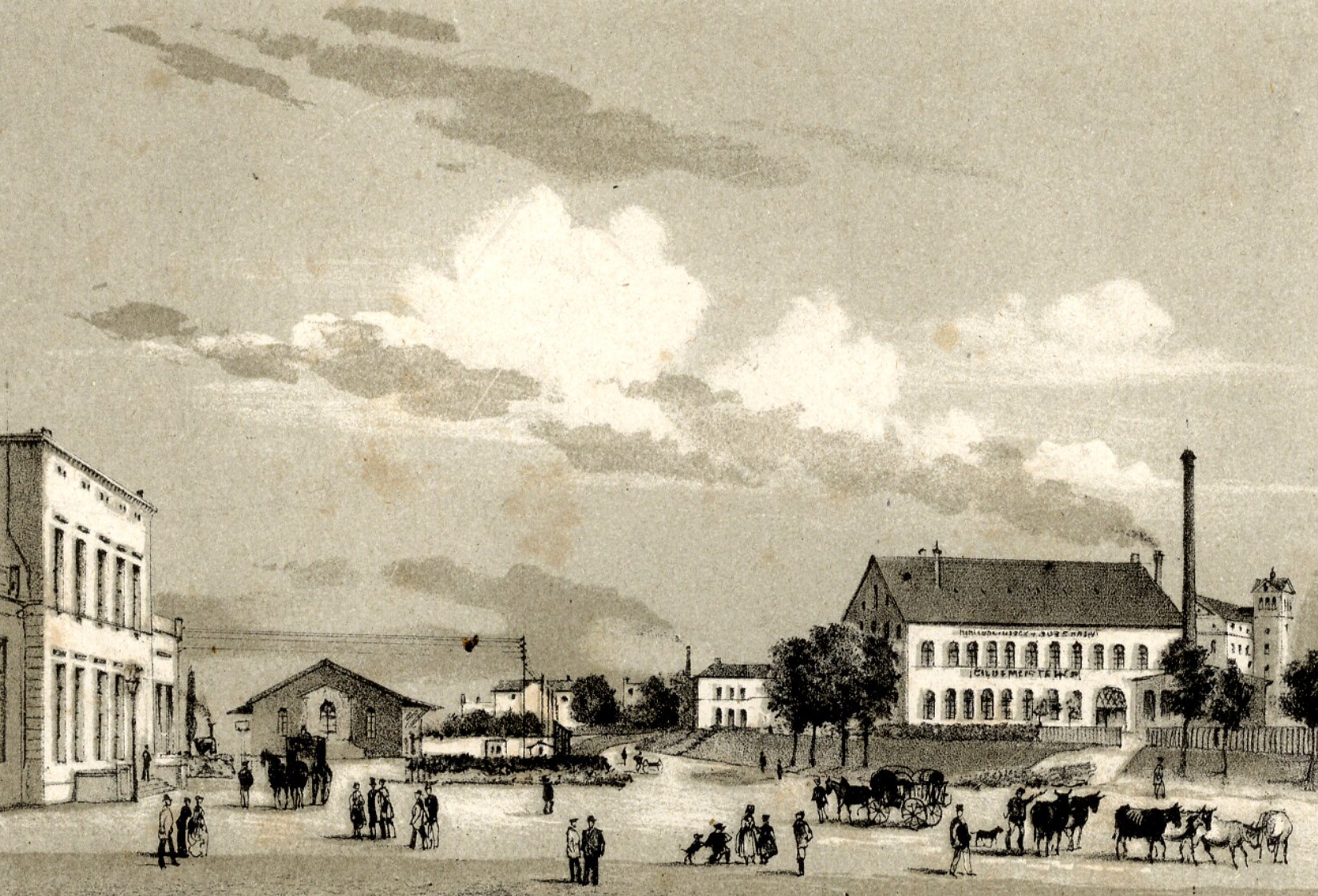 Als am 15. Oktober 1847 die Köln-Mindener Eisenbahn ihren Betrieb aufnahm, standen an fast allen Bahnhöfen nur provisorische Bahnhofshallen. Auch Lokomotiv- schuppen, Koksmagazine, Schmieden und Wassertürme waren anfangs Behelfsbauten. So auch in Bielefeld. Hier sollte das vorläufige Gebäude erst zwei Jahre später durch ein endgültiges ersetzt werden. Die Lage des neu gebauten Bahnhofs war anfangs umstritten, da er „weit” außerhalb der Stadt auf „Crüwells Kamp” errichtet worden war. Das änderte sich durch die Ansiedlung der Bielefelder Industrie rund um das Bahnhofsgelände. Der Industrie folgten bald die ersten Wohnungen an der Bahnlinie.