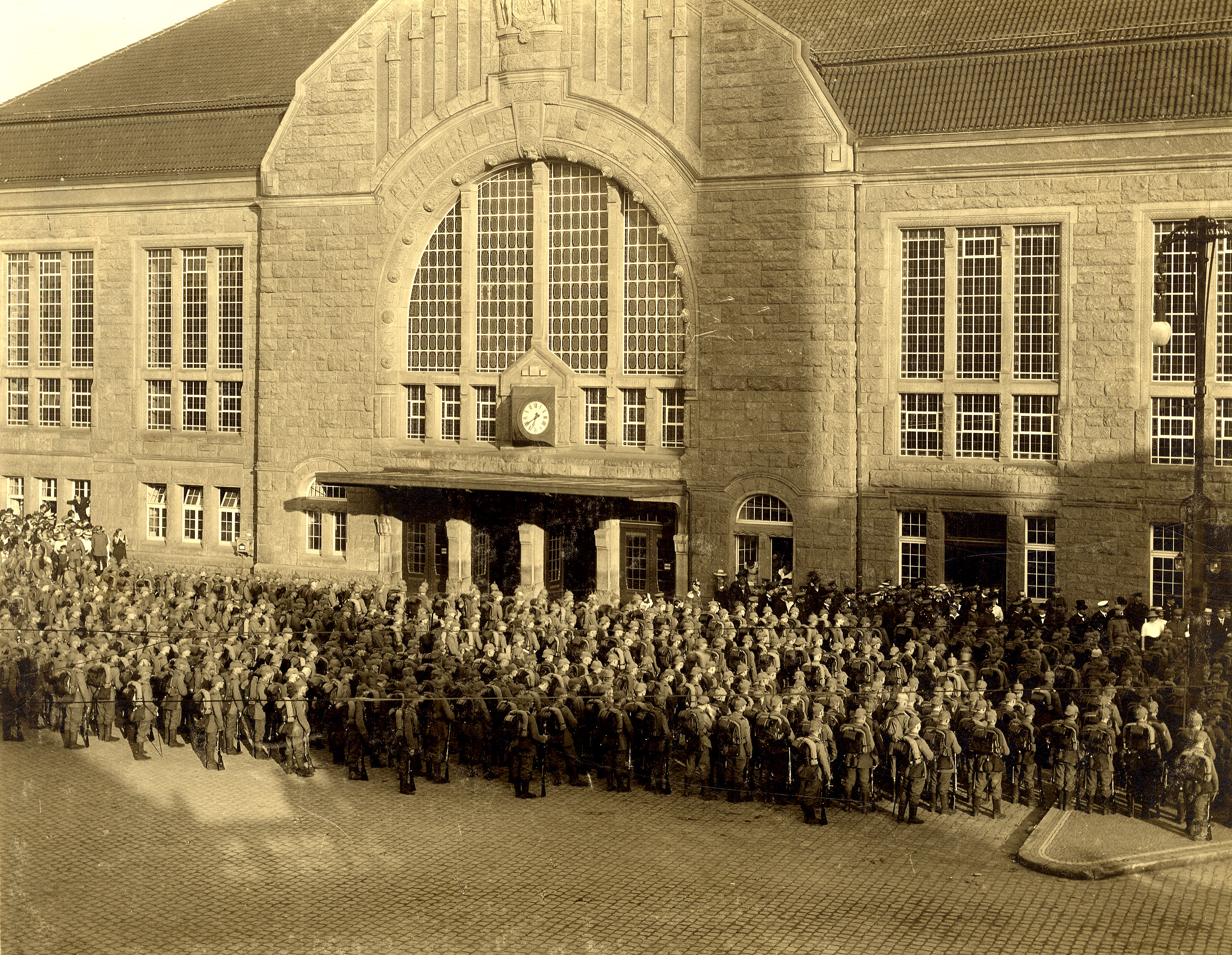 „Mit Aufbietung aller Kräfte ist es der Eisenbahnverwaltung gelungen, den festgesetzten Termin für die Überleitung des Verkehrs nach dem neuen Bahnhofsgebäude einzuhalten. […] Wenn man sich von der Düppelstraße her dem neuen Gebäude nähert, leuchten einem von weitem die deutlichen Ziffern der großen Stationsuhr entgegen, die vor einigen Tagen in Gang gesetzt worden ist. Sie weist zwei im Winkel zueinanderstehende Zifferblätter auf, so dass man auch von der Bahnhofstraße und der Kleinen Bahnhofstraße deutlich die Zeit erkennen kann. Vielleicht hätte sie etwas höher angebracht werden können, damit sie auch noch in unmittelbarer Nähe des Gebäudes sichtbar blieb, wo sie jetzt durch das über dem Portal befindliche Vordach verdeckt wird”, berichtet die Westfälische Zeitung am Samstag, den 30. April 1910.