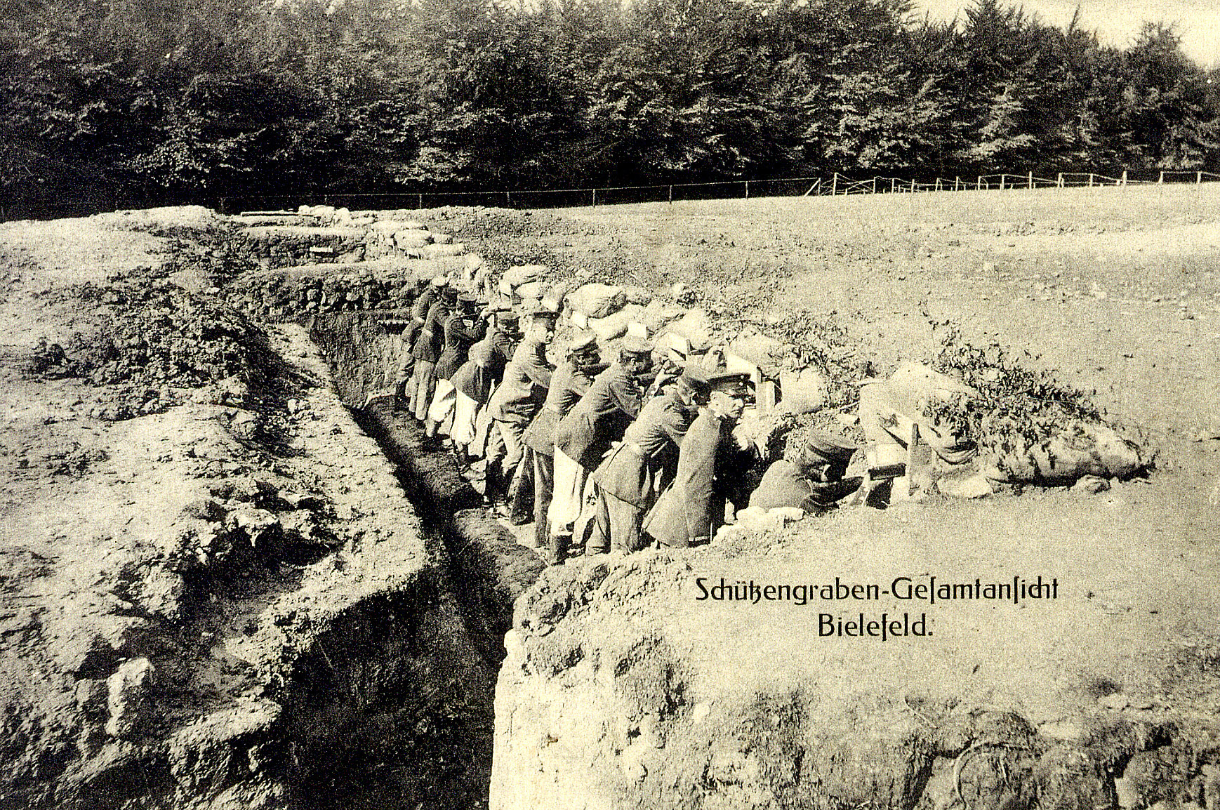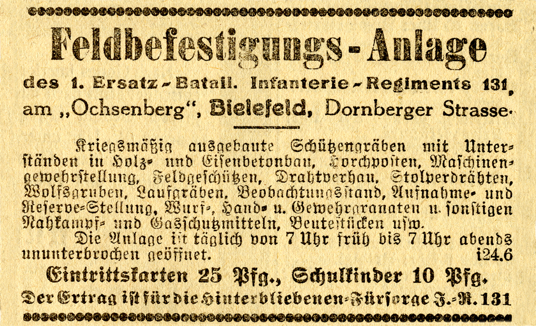 „In dem gegenwärtigen Kriege, besonders im Stellungskampfe auf dem westlichen Kriegsschauplatze, spielt bekanntlich der sogenannte Schützengraben oder richtiger gesagt, die Feldbefestigung eine außerordentliche Rolle. Das hiesige Ersatzbataillon Inf.-Reg. 131 hat auf dem Ochsenberge ein Stück einer solchen Feldbefestigung mit allen ihren Einrichtungen, wie sie die moderne Kriegstechnik erfunden hat, durch im Felde gewesene und erfahrene Mannschaften angelegt“, erfuhr die Bielefelder Bevölkerung am 25. Juni 1915 aus den Zeitungen. Gleichlautend berichteten sowohl die konservativen Westfälischen Neuesten Nachrichten als auch die sozialdemokratische Volkswacht über die Attraktion in Bielefeld. Offensichtlich hatte eine Pressemitteilung des Militärs zur Eröffnung des Schauschützengrabens auf der Ochsenheide vorgelegen, der den Kriegsalltag aber nur unzureichend darstellen konnte.