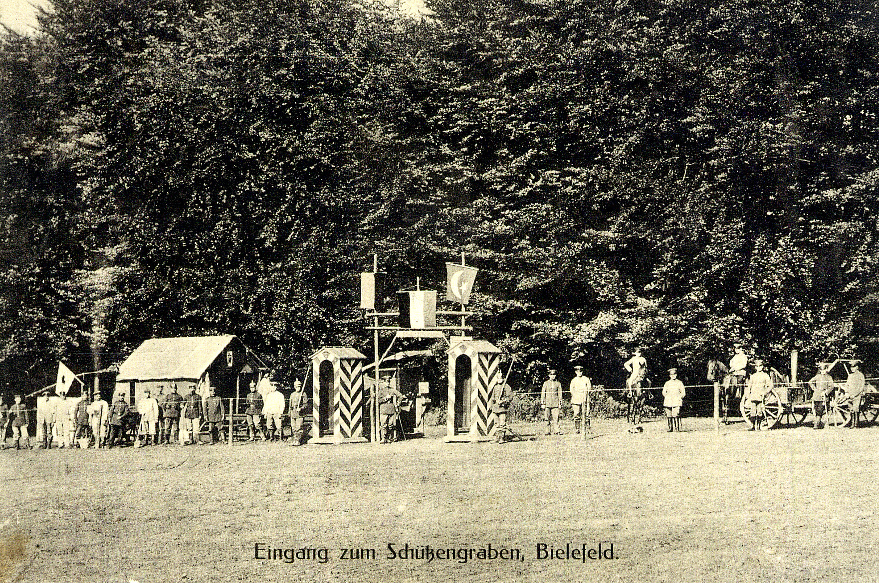 Daran änderte auch der Schauschützengraben auf der Ochsenheide nichts, der Ende Juni 1915 für das Publikum eröffnet wurde. Errichtet hatte die Feldbefestigungsanlage das Ersatz-Bataillon des 131. Infanterieregiments, das zu Kriegsbeginn vom zu nah am Kriegsgebiet liegenden Mörchingen im Saarland nach Bielefeld verlegt worden war. Allerdings handelte es sich bei diesem Mustergraben nicht um eine Bielefelder Erfindung: In Berlin und Frankfurt lockten ähnliche Anlagen die Bevölkerung seit dem Frühjahr 1915 zur kuriosen „Kriegskirmes“. Zuvor hatten Miniaturmodelle und Stoffpuppen erste Eindrücke vermittelt.
