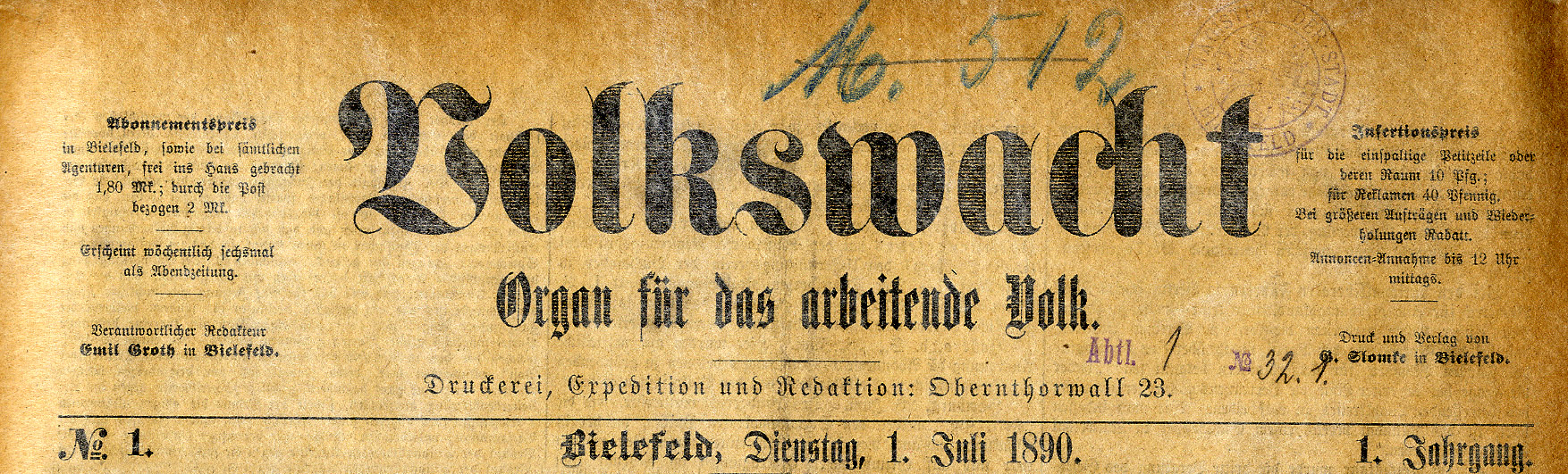 Wagner, Bernd J., 1. Juli 1890: In Bielefeld erscheint mit der „Volkswacht“ zum ersten Mal eine sozialdemokratische Zeitung, Stadtarchiv und Landesgeschichtliche Bibliothek Bielefeld, https://historischer-rueckklick-bielefeld.com/2010/07/01/01072010/, Bielefeld 2010