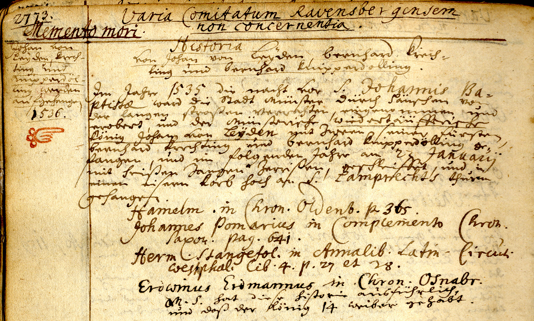 - Stadtarchiv Bielefeld, Bestand 300,5/Handschriften, gebunden, Nr. 81: Wolff Ernst Aleman, Collectanea Ravensbergensia, Bd. 4, S. 2773 (Erwähnung der Eroberung Münsters 1535)