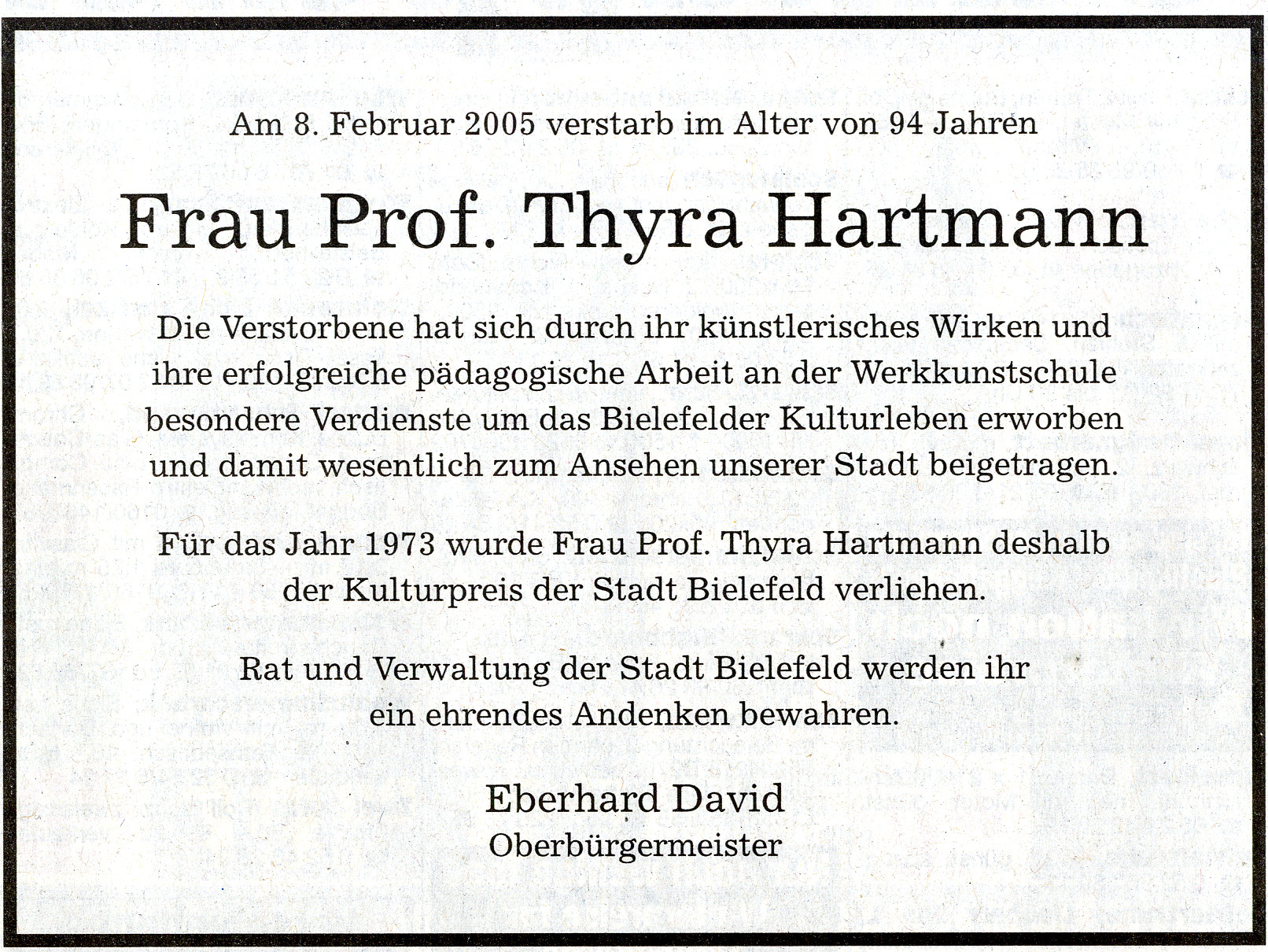 Giesecke, Dagmar, 30. Oktober 1910: Thyra Hamann-Hartmann, Leiterin der Textilklasse an der Werkkunstschule, wird in Posen geboren, Stadtarchiv und Landesgeschichtliche Bibliothek Bielefeld, https://historischer-rueckklick-bielefeld.com/2010/10/01/01102010/, Bielefeld 2010