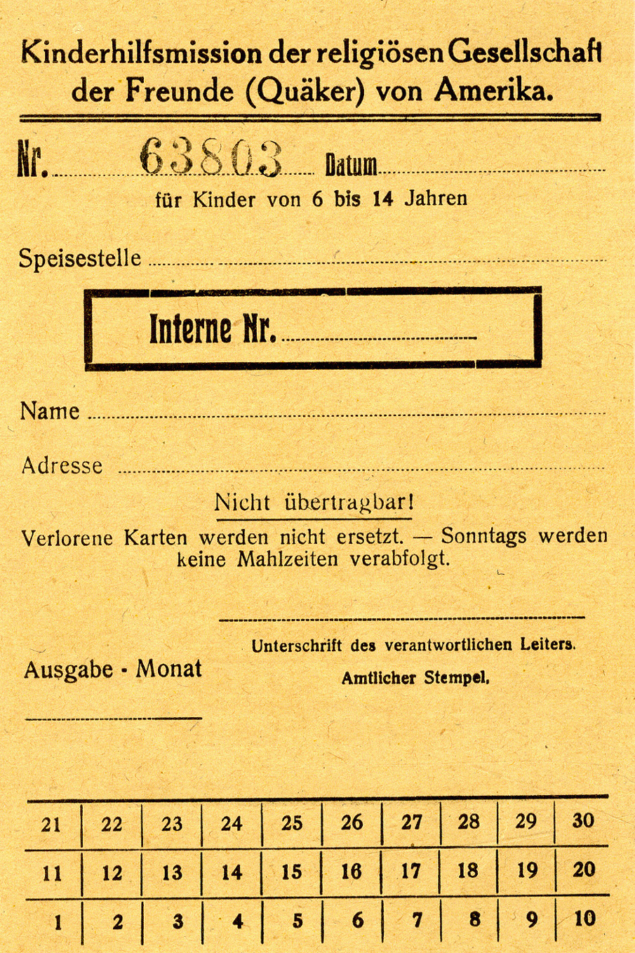Die amerikanische Kinderhilfsmission hatte sich schon während des Krieges in Frankreich und Belgien engagiert, durch Speisungen der Not entgegenzuwirken. Deutschland ließ aber bis 1918 keine Hilfen zu, wenn sie aus dem „feindlichen Ausland” kam. Nach dem Krieg wurde diese verhängnisvolle Position aufgegeben, als 1919 eine Delegation der Quäker erstmals Deutschland bereiste und beschloss, die Hilfe auch in deutschen Industriestädten anzubieten. Nach dem Selbstverständnis der Quäker, die sich noch immer weltweit für Notleidende engagieren, beruht diese Hilfe „auf religiöser Grundlage. Sie stellt einen Versuch dar, den Glauben der Gesellschaft der Freunde, daß dauerndes Heil nicht aus Gewalt und Krieg, sondern nur aus Liebe und Dienst an den Nächsten erwachsen kann, in die Tat umzusetzen.”