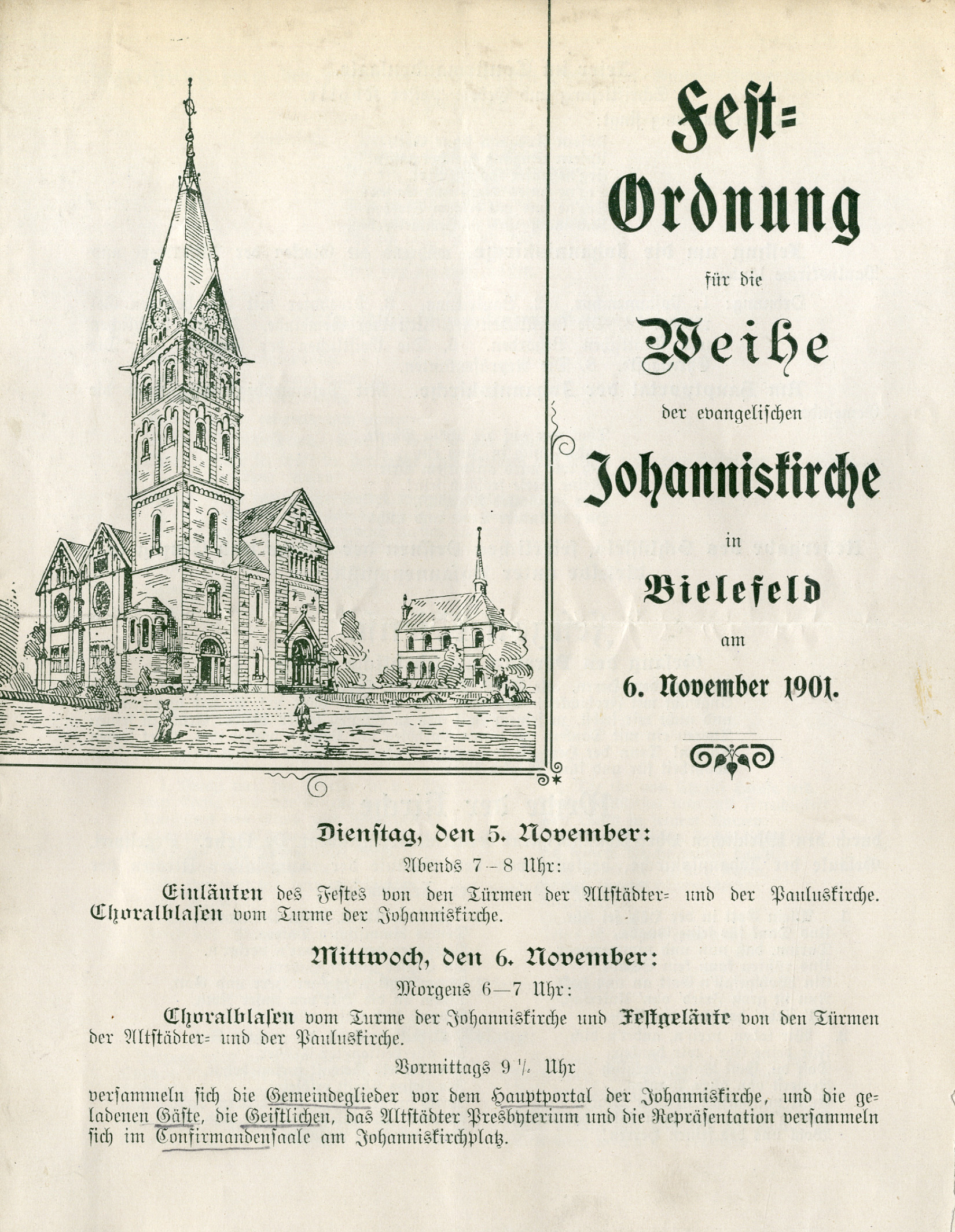 „Am 6. November 1901 wurde nach einer Bauzeit von 2 Jahren die Johanniskirche geweiht. […] Der Name der Kirche wurde von dem nahegelegenen Johannisberg gewählt, einem ehemaligen Besitztum der Stiftskirche des benachbarten Schildesche“, beschreibt die Festschrift „Zum Gedächtnis an die 25. Wiederkehr des Weihetages der ev. Johanniskirche Bielefeld.“