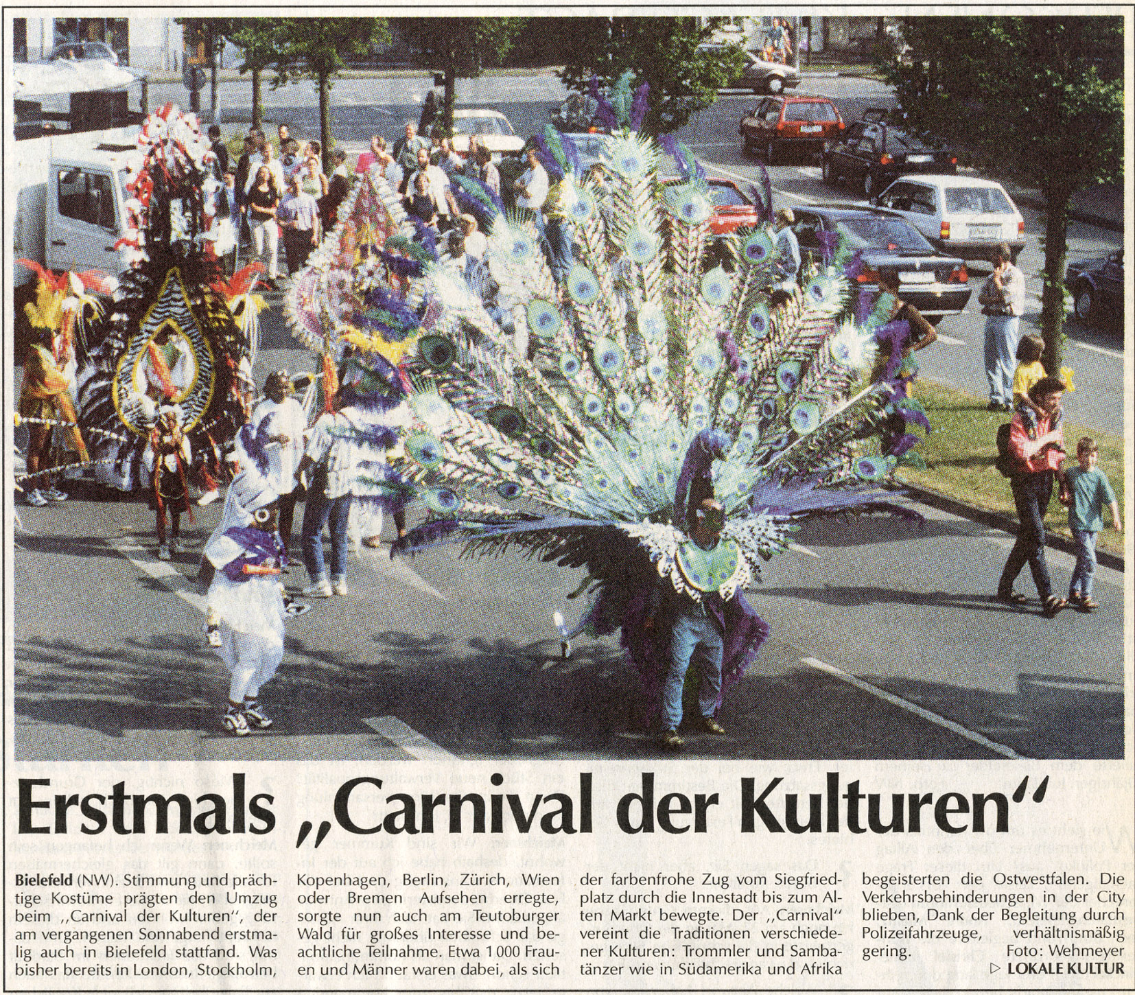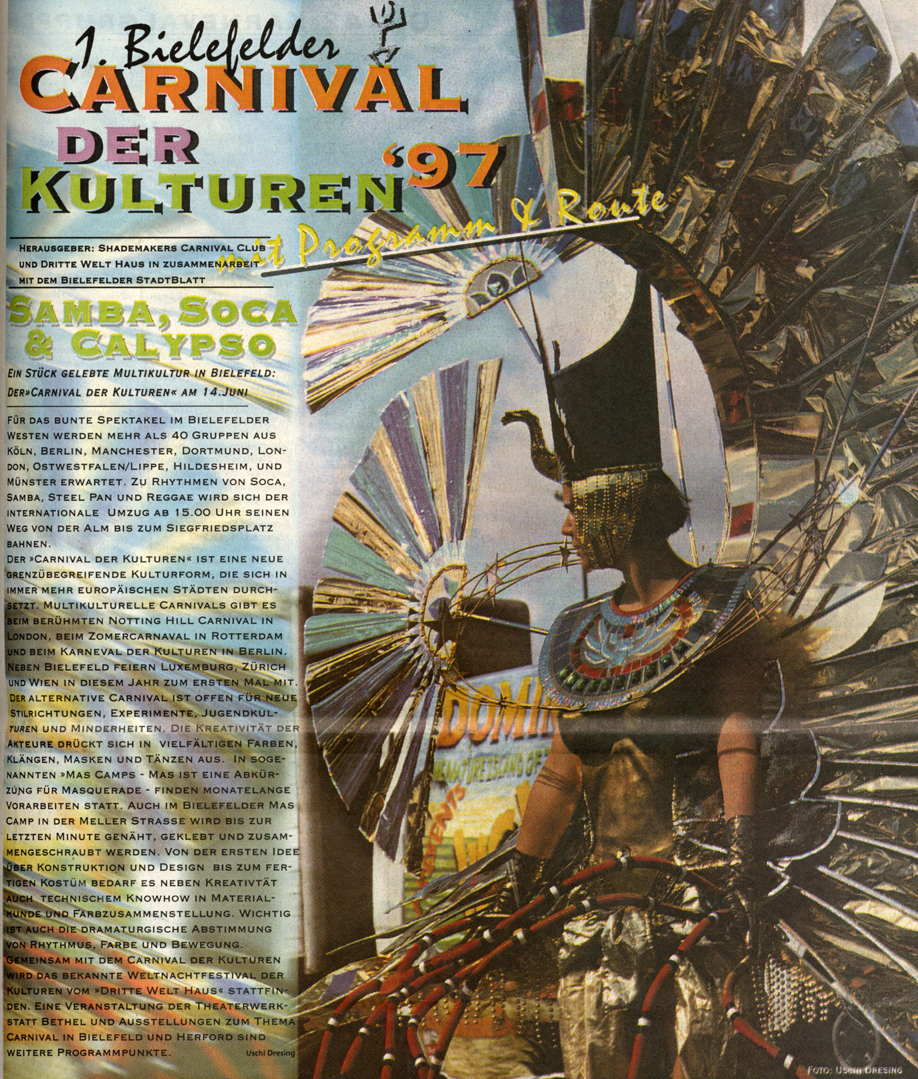 „Für das bunte Spektakel im Bielefelder Westen werden mehr als 40 Gruppen aus Köln, Berlin, Manchester, Dortmund, London, Ostwestfalen/Lippe, Hildesheim und Münster erwartet. Zu Rhythmen von Soca, Samba, Steel Plan und Reggae wird sich der internationale Umzug ab 15.00 Uhr seinen Weg von der Alm bis zum Siegfriedplatz bahnen. Der ‚Carnival‘ der Kulturen ist eine neue grenzübergreifende Kulturform, die sich in immer mehr europäischen Städten durchsetzt.” Mit diesen Sätzen beginnen die Sonderseiten des StadtBlatts von 5. Juni 1997.
