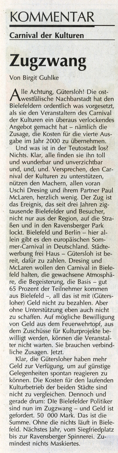 „Das Raunen und der Applaus begannen auf dem Siegfriedplatz in Bielefeld. Von dort setzte sich zum dritten Mal der ‚Carnival der Kulturen”, ein alternativer und bunter und künstlerischer und brodelnder Zug, in Bewegung – und mehr als 50 Gruppen beteiligten sich an dem Tänzelnden Marsch durch die Bielefelder Innenstadt”, teilte die NW vom 7. Juni 1999 mit. Der Ultimo vom 17. Mai des Jahres titelte allerdings nicht ganz so euphorisch: „Carnival is over? Das dritte karibische Maskenlaufen könnte Bielefelds letztes sein.” In dasselbe Horn blies auch die Neue Westfälische von 8. Mai, wo sie anmerkt, dass eine solche Veranstaltung nur in Bielefeld gehalten werden kann, wenn öffentliche Gelder fließen werden. Die Nachbarstadt Gütersloh hatte zur selben Zeit den Veranstaltern für das nächste Jahr ein lukratives Angebot gemacht. Gerne wollten sie die Parade nach Gütersloh holen und sämtliche Kosten übernehmen. Es wurde intensiv geprüft, aber schließlich doch abgelehnt, weil der Carnival der Kulturen zu eng mit Bielefeld verbunden war. Mehr als 60 Prozent der Teilnehmer und Teilnehmerinnen kamen inzwischen aus der Stadt selbst.