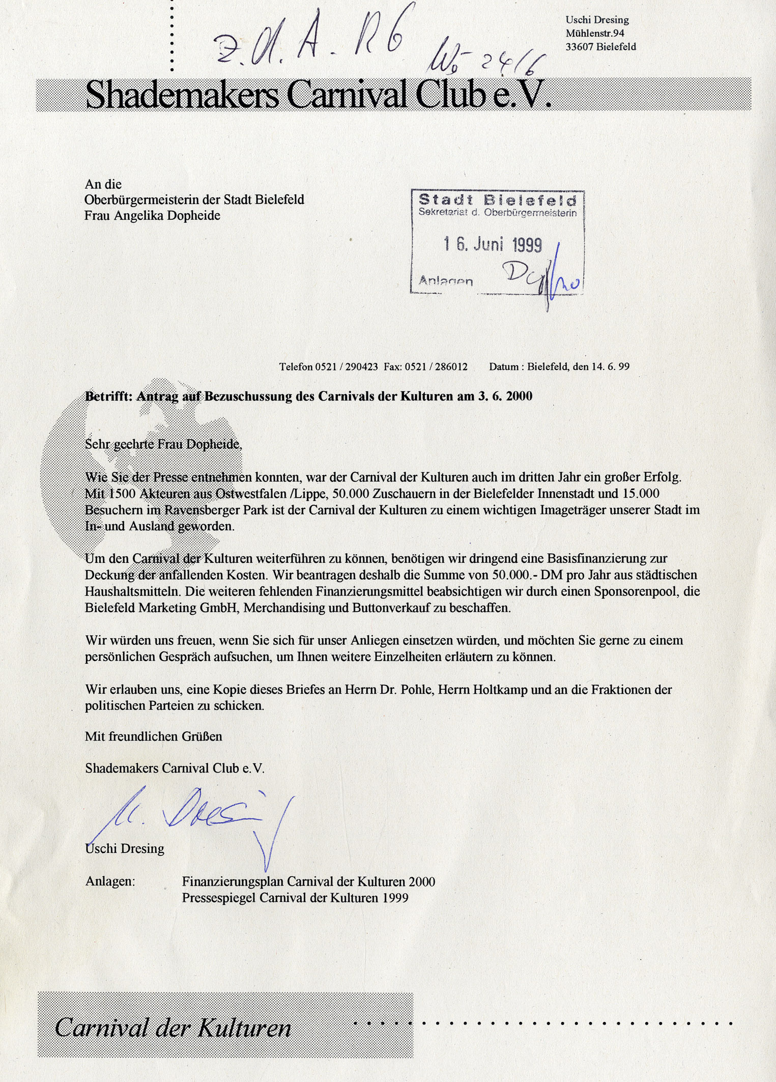 Die Tageszeitungen waren nach dem Wochenende ein weiteres Mal voll des Lobes. Wieder titelte die NW vom 7. Juni 1999: „Mehr als 50 000 Zuschauer auf der Straße – 15 000 im Ravensberger Park: Carnival der kulturellen Superlative.” Und das Bielefelder StadtBlatt überschrieb seinen Artikel mit den Worten: „Everybody loves it Gratis! Der Tag an dem 50.000 Bielefelder ihren Therapeuten vergessen konnten”. Wenige nach den Festivitäten schrieb Uschi Dresing im Auftrag des Shademakers Carnival Club e.V. einen Antrag auf Bezuschussung für das nächste Jahr. Nur mit Geldern der öffentlichen Hand könne die Veranstaltungsreihe auch im nächsten Jahr fortgeführt werden. Wenn die Stadt eine feste Summe von 50 000 DM regelmäßig zur Verfügung stellen würde, wären die weiteren Spektakel gesichert.