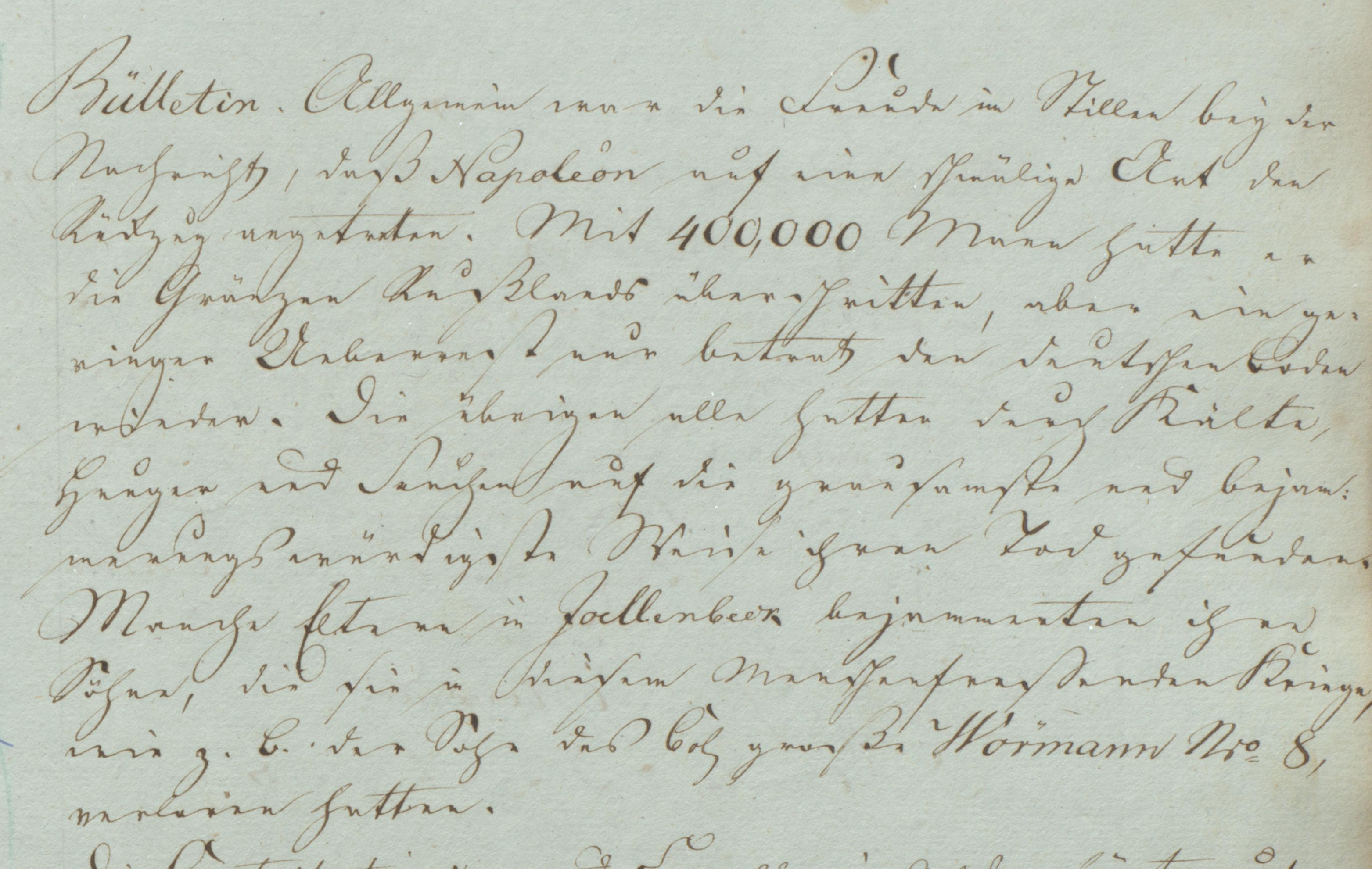 Die Jöllenbecker Amtschronik berichtete über den Auftakt der gewaltigen Strafexpedition: „Es brach der Krieg zwischen Frankreich und Russland aus, in welchem auch viele Jünglinge aus Joellenbeck unter verschiedenen Regimentern theilnehmen mussten. Im Anfange dieses Krieges machten die gegen Russland verbündeten Truppen glänzende Fortschritte, deswegen auch Dank und Siegesfeste gefeyert werden mussten.“ Tatsächlich stieß die Grande Armée trotz widriger Wetterbedingungen zügig vor, zu zügig, denn der unverzichtbare Nachschub stockte – fatal in einem dünn besiedelten Gebiet, das derartige Menschenmassen nicht ernähren konnte. Die russische Armee stellte sich nicht zur Entscheidungsschlacht, die Napoleon im Vertrauen auf einen kurzen Feldzug erhofft hatte. Sie zog sich immer weiter in das Landesinnere zurück, ohne dass ein konkreter Plan bestand, den Feind in das endlos scheinende Russland zu locken. Vielmehr zwangen die militärische und taktische Unterlegenheit zum Rückzug, wobei es kein abgestimmtes Programm der „verbrannten Erde“ gab, um den Franzosen die Versorgungsgrundlage zu entziehen. Nach nur vier Tagen besetzte die Grande Armée Wilna, am 8. Juli 1812 bereits Minsk, hatte aber vor allem durch Desertionen, Entkräftung und Krankheiten schon mehr als 135 000 Soldaten verloren, ohne dass es größere Gefechte gegeben hatte. Die erste große Bataille endete zwar mit der Besetzung von Smolensk durch die zusehends zerfallende Grande Armée, zur Entscheidungsschlacht hatten sich die Russen allerdings nicht gestellt. Auch bei Borodino trat am 7. September 1812 kein klarer Sieger hervor, denn die Franzosen hatten zwar das Feld behauptet und weniger Verluste erlitten, konnten diese aber kaum noch ausgleichen. Nur eine Woche später rückte Napoleon in Moskau ein und wartete auf Verhandlungen mit dem Zaren – zu lange: Während die Stadt durch Brände zu 75 % zerstört wurde, führten die Russen Verstärkungen heran. Am 19. Oktober 1812 begann der Rückzug der noch 100 000 Mann zählenden Armee Napoleons, deren Versuch, nach Süden durchzubrechen, von den Russen jedoch abgewiesen wurde, so dass der alte, bereits ausgemergelte Anmarschweg – beladen mit Unmengen an Beutegut und in Begleitung eines etwa 32 000 Menschen umfassenden Tross´ – erneut zu nehmen war.