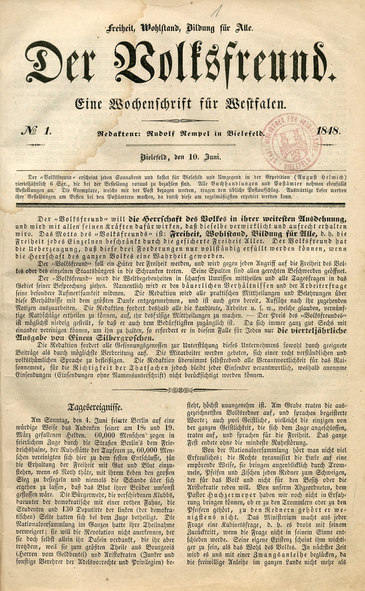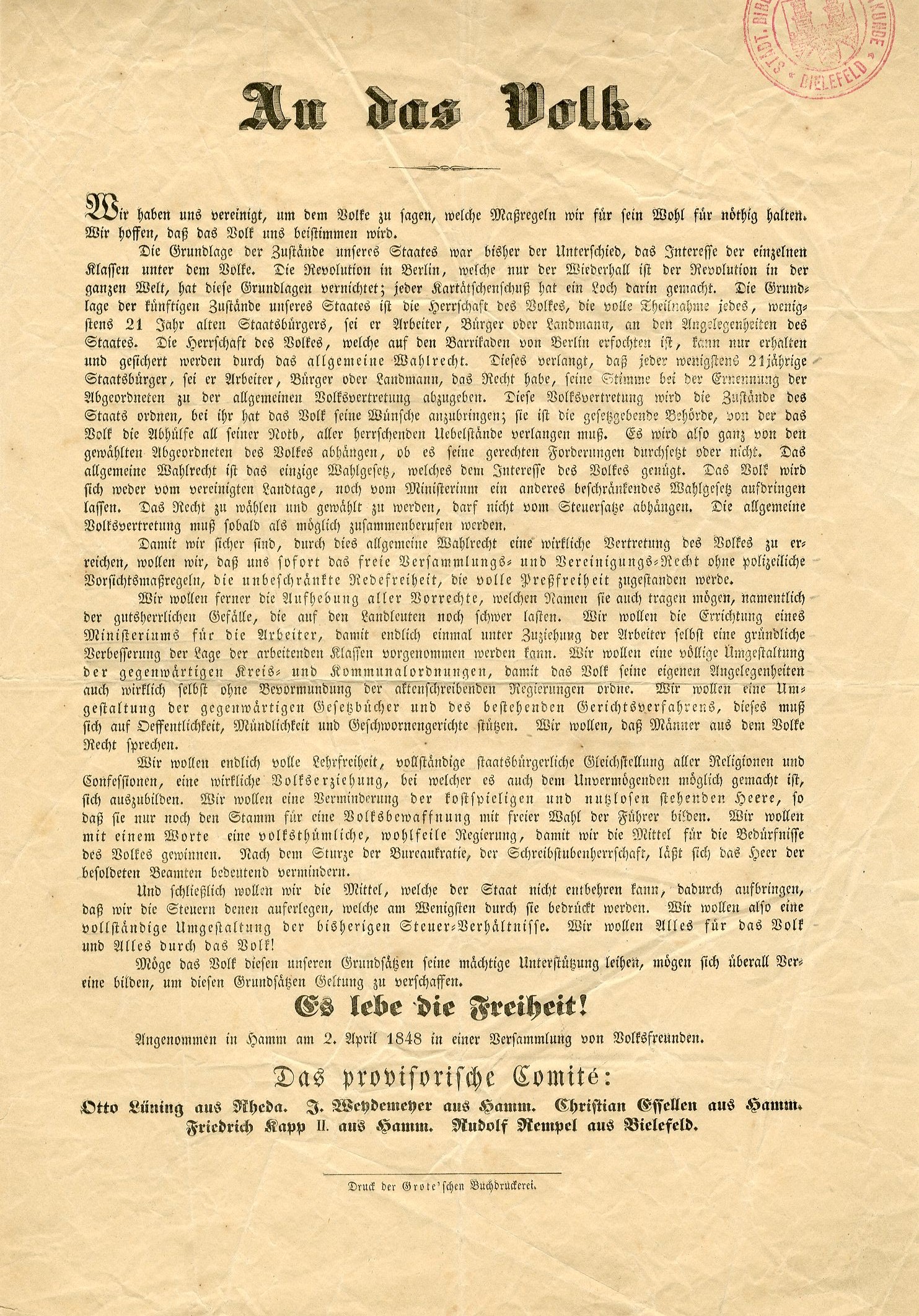 „Wir wollen Alles für das Volk und Alles durch das Volk! […] Es lebe die Freiheit!”, schloss ein Aufruf, den eine „Versammlung von Volksfreunden” am 2. April 1848 in Hamm veröffentlichte. Zum Leitungs-Komitee und zu den fünf namentlich genannten Unterzeichnern zählte der Bielefelder Unternehmer Rudolf Rempel, der danach zum auffälligsten Akteur der 48er-Revolution in Bielefeld avancierte, dessen Programm und Ambitionen aber ebenso scheiterten wie die Revolution insgesamt.