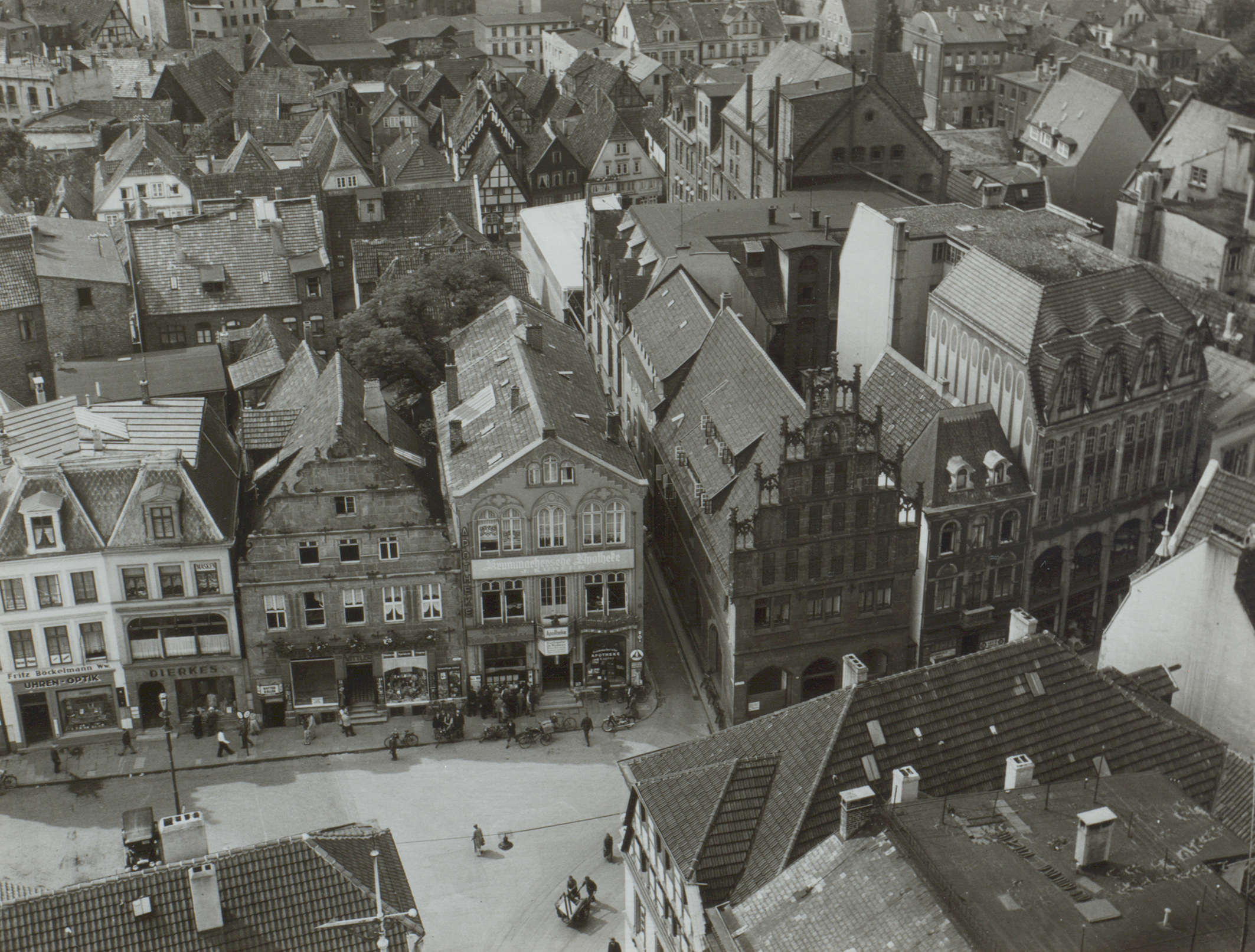 Ist damit der Name schon belegt, so gilt dieses jedoch noch nicht für den Standort am Alten Markt. Dieser erschließt sich aus der Kombination der Inhalte von zwei Urkunden, genauer gesagt Schuldverschreibungen von 1671 und 1691, die Frank Konersmann ausgewertet hat. Zunächst wird Anton von Segern in einem auf 1671 datierten Vermerk als „Apoth.” auf der Rückseite einer Urkunde von 1532 erwähnt, der eine Schuldverschreibung auf das Haus Nr. 43 (Am Alten Markt 9) übernommen haben soll. 1683 sei dann Johann Hinrich Koch in diese Verpflichtung eingetreten. Aber auch die städtischen Verwaltungsmitarbeiter der Vergangenheit waren nicht fehlerfrei, denn Anton Segern und danach Johann Hinrich Koch gehörte das Haus Nr. 63 (also Am Alten Markt 10). Dieses wiederum erschließt sich aus der Ortsangabe eines Notariatsinstrumentes vom 1691, als der Notar Johann Heinrich Delbrügge ein Geldgeschäft beurkundete, und zwar „in des WohlEhrenvesten auch Wohlfürnehmen Herrn Heinr. Cochens Apothekers alhir am marckte ansehnlich befindlicher behaußung, Eingangs zur lincken Hand daselbst erbauter Stuben”. Die korrekte Verknüpfung von Namen und Orten führt zum richtigen Ergebnis.