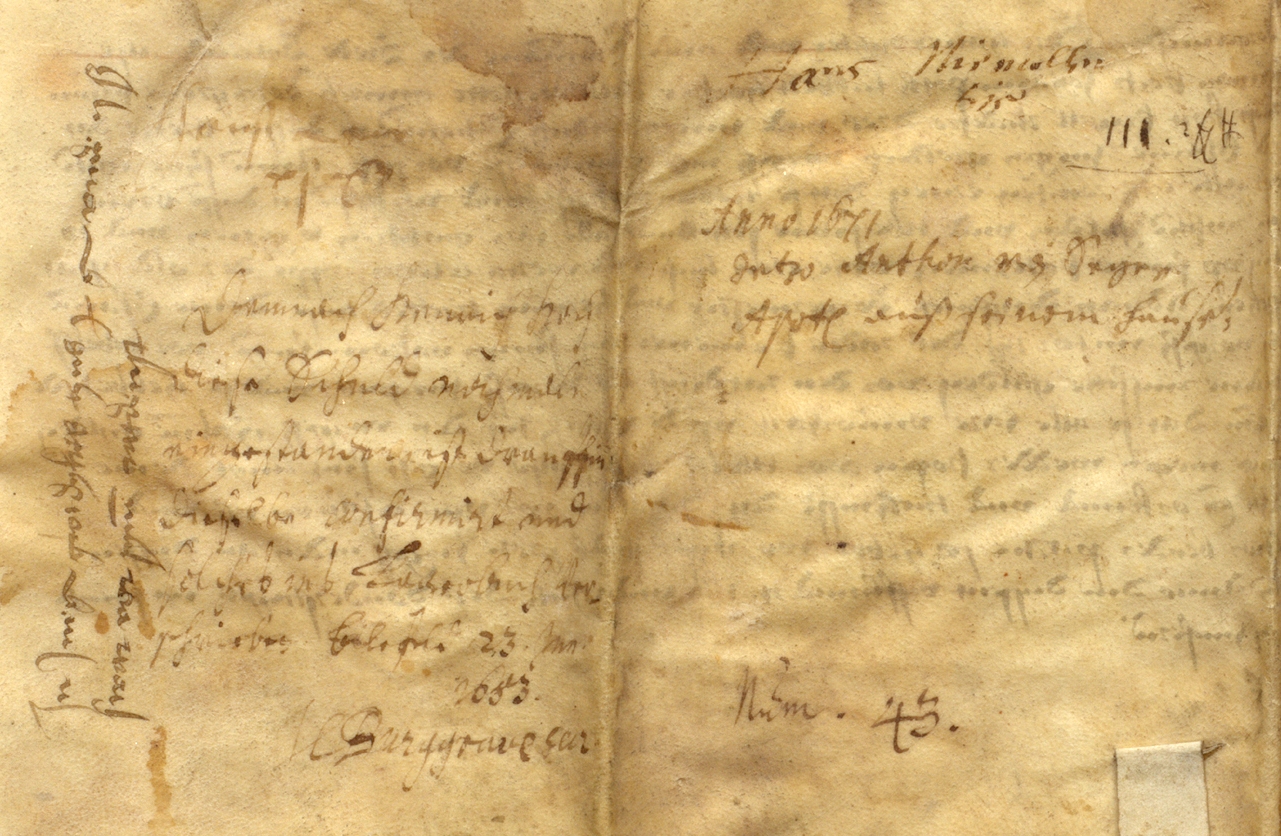 - Bestand 100,1/Urkunden, Nr. 533: Vor dem Notar Johann Heinrich Delbrügge nimmt Gerhard Böddeker bei Dr. med. Adolph Dreckmeier eine Schuld von 500 Reichstalern auf; 1691 April 28