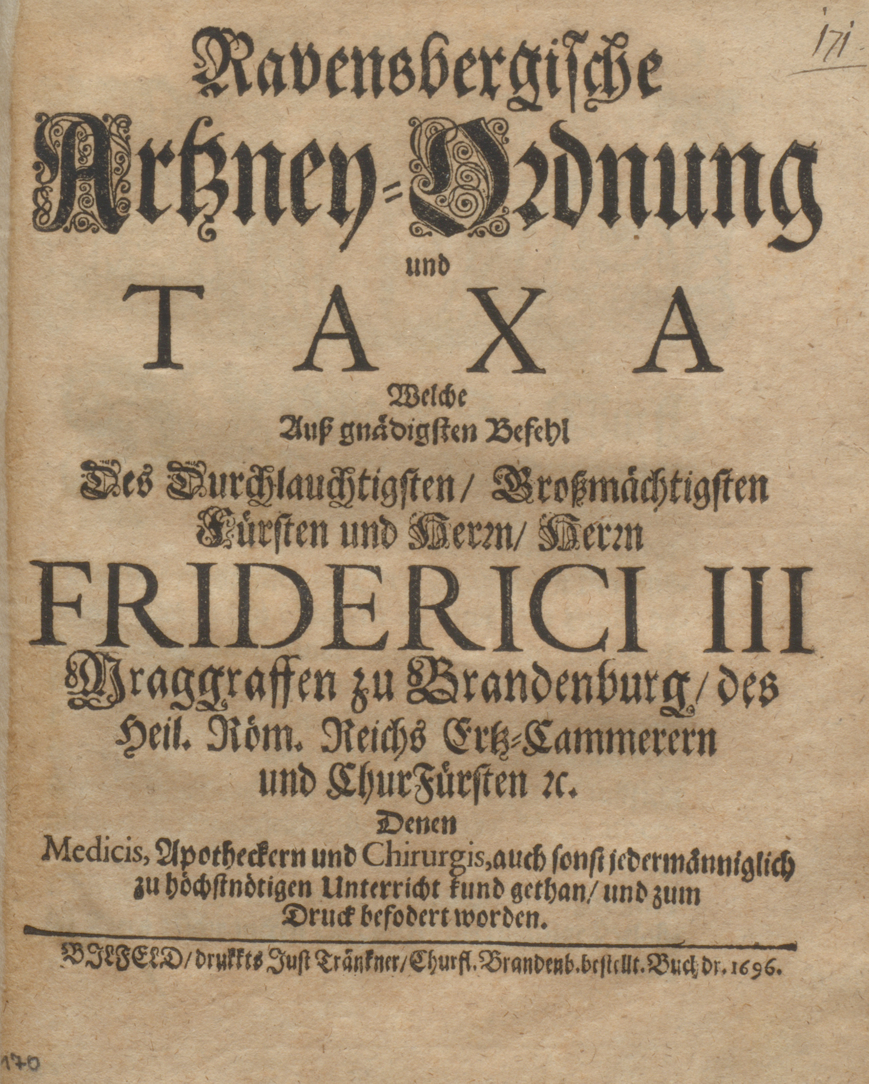 Speziell für die Grafschaft Ravensberg erschienen 1696 eine „Ravensbergische Artzney-Ordnung und Taxa” und eine gesonderte „Taxa Medicamentorum” (59 S.). Beide waren in Bielefeld von Justus Tränckner hergestellt worden, dessen Druckerei 1671 privilegiert worden war. Anlass für die Publizierung waren Feststellungen über medizinische Mängel in der Grafschaft und den Städten: „allerley Unordnung entstanden / und mercklicher Schade an Leib und Leben Dero getreuen Unterthanen zugefüget worden / daß sich nicht gnugsam qualificirte Leute unternommen praxin Medicam zu üben / auch es auff den Apotheken an guter Auffsicht gefehlet.”
