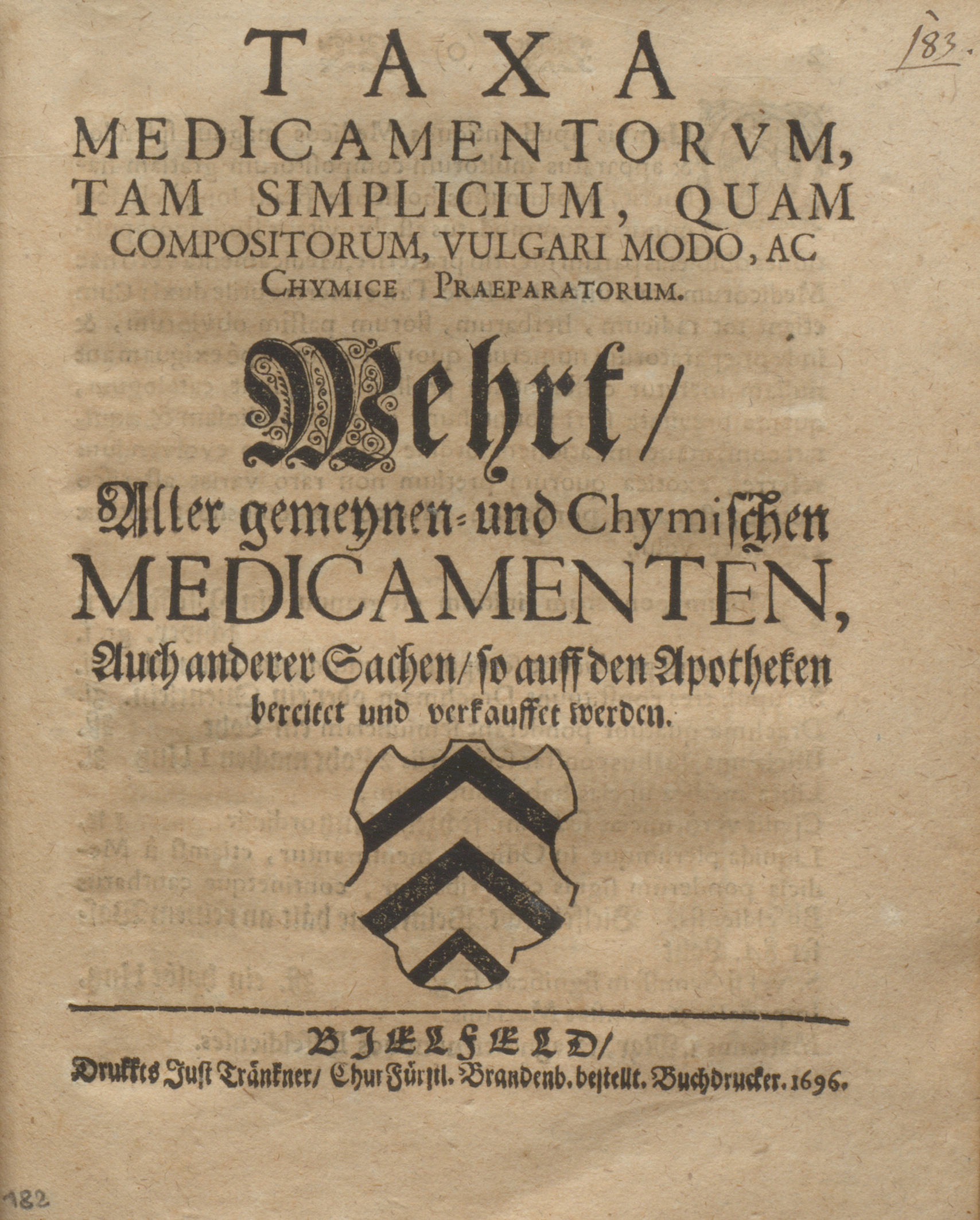 - Bestand 300,5/Handschriften, gebunden, Nr. 81: Wolff Ernst Aleman, Collectanea Ravensbergensia, 1688-1725 (1757-1763), hier Bd. 10: fol. 171r–182v (Ravensbergische Artzney-Ordnung und Taxa […], Bielefeld 1696); fol. 183r–212v (Taxa Medicamentorum […], Bielefeld 1696)