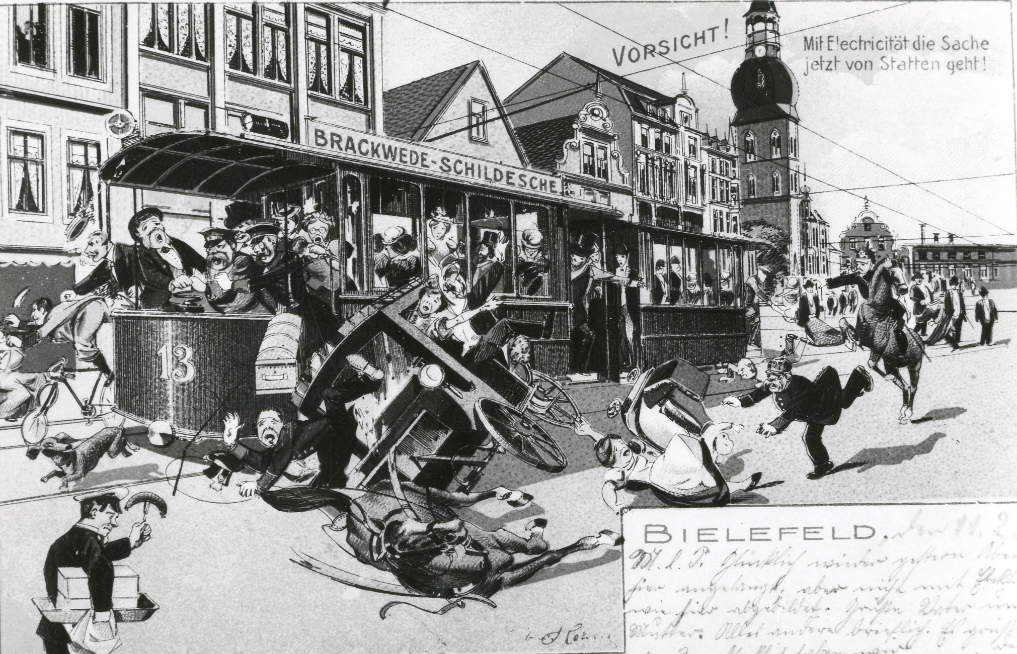 Dabei war die Linienführung durch die Altstadt durchaus konsequent, als die „Elektrische”, wie die Straßenbahn anfangs genannt wurde, erstmals am 20. Dezember 1900 durch die Niedern- und Obernstraße fuhr. Hier hatten die wichtigsten Geschäfte ihr Domizil, hier pulsierte das Leben. Allerdings zeigte es sich bereits bei der Jungfernfahrt, dass die Straßenbahn durch ein Nadelöhr fuhr, wodurch Stockungen unvermeidlich waren. So legten beispielsweise Geschirrführer, die „vor der Elektrischen herfuhren, oftmals eine sehr unangebrachte Gleichgültigkeit an den Tag” und wichen der neuen Technik nicht aus. Während erwachsene Passanten auf die Klingelzeichen achteten und „mit neugierigen Blicken” die Bahnen an sich vorbeifahren ließen, machte „die liebe Jugend den Wagenführern das Leben recht sauer, indem sie, oft 20-30 an der Zahl, die Wagen vorn, hinten und an der Seite umkreisten”. Diese Mutproben gingen aber wahrscheinlich glimpflich vonstatten. Dagegen mussten manche Fahrgäste erst lernen, verletzungsfrei die „Elektrische” zu verlassen. „Das Abspringen in der verkehrten Richtung musste schon ein Fahrgast auf der Obernstraße spüren, der in voller Fahrt absprang und sich recht unsanft auf das Asphaltpflaster setzte”, wusste die Westfälische Zeitung zu berichten. „Auch eine Frau […] traute sich zu viel zu und fiel gleichfalls hin.” In den ersten Tagen stiegen auch manche Fahrgäste in die verkehrten Wagen, weil sie dachten, dass die Straßenbahn nur nach Brackwede führe. Sie mussten erst lernen, dass die „Elektrische” vom Rettungshaus in Schildesche, dem heutigen Johannesstift, über die Innenstadt nach Brackwede und wieder zurückfuhr.