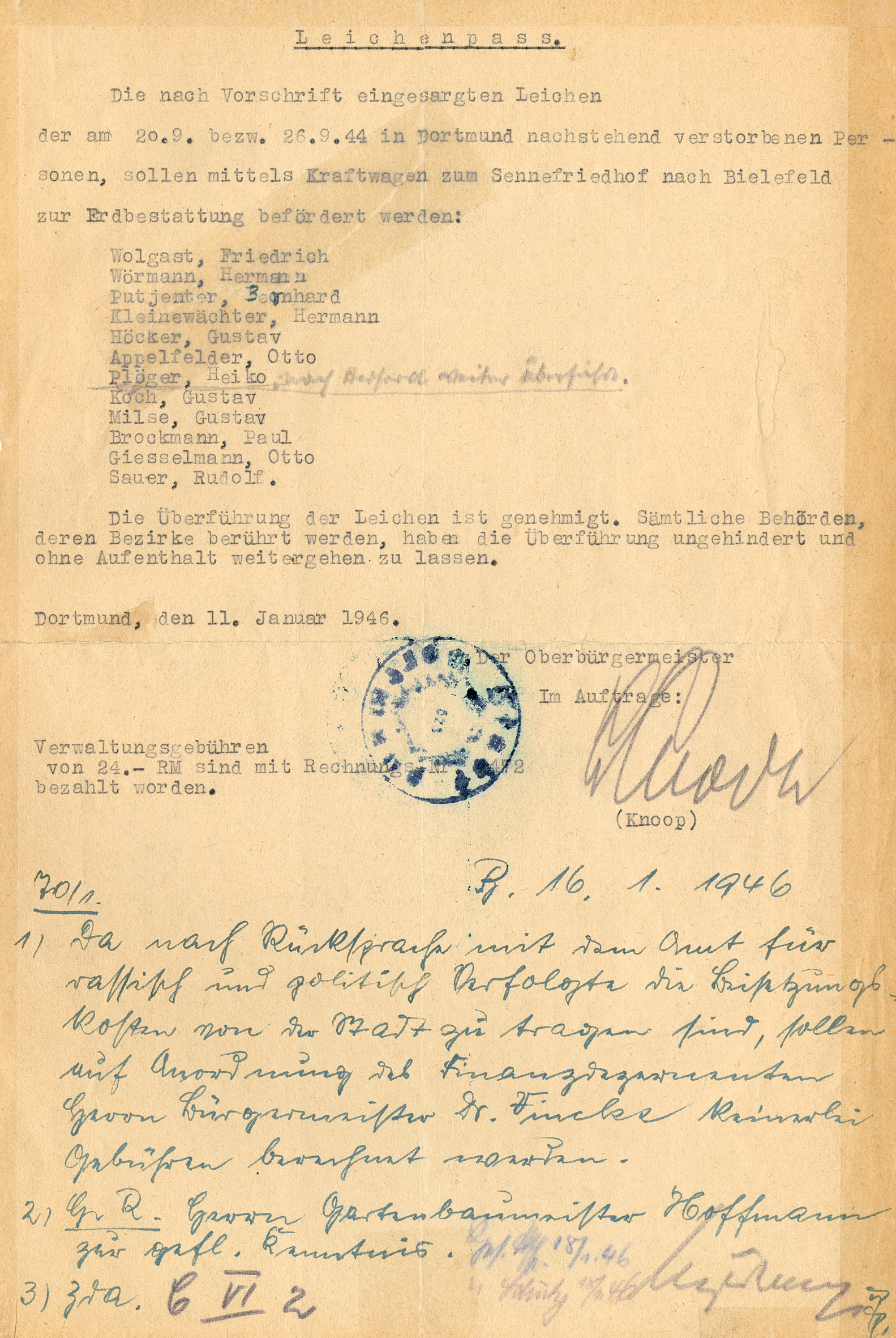 Nach der Hinrichtung hatte man die 13 Leichen einfach auf einem Dortmunder Friedhof an einer Friedhofshecke verscharrt und die Gräber unkenntlich gemacht. Erst nach langem Suchen fanden die Angehörigen diese Verstorbenen wieder, so dass sie im Dezember 1945 nach Bielefeld überführt und später auf dem Ehrenfeld bestattet werden konnten. Es waren die Arbeiter Otto Appelfelder, Paul Brockmann, Otto Giesselmann, Gustav Höcker, Hermann Kleinewächter, Gustav Koch, Gustav Milse, Bernhard Putjenter, Rudolf Sauer, Hermann Wörmann, Friedrich Wolgast, Bernhard Zawacki und Heiko Plöger, der aus Herford stammte. In den darauf folgenden Wochen wurde in den Bielefelder Betrieben von den Belegschaften für ein Ehrenmal gesammelt, dessen Realisierung aber noch einige Zeit auf sich warten lassen musste.