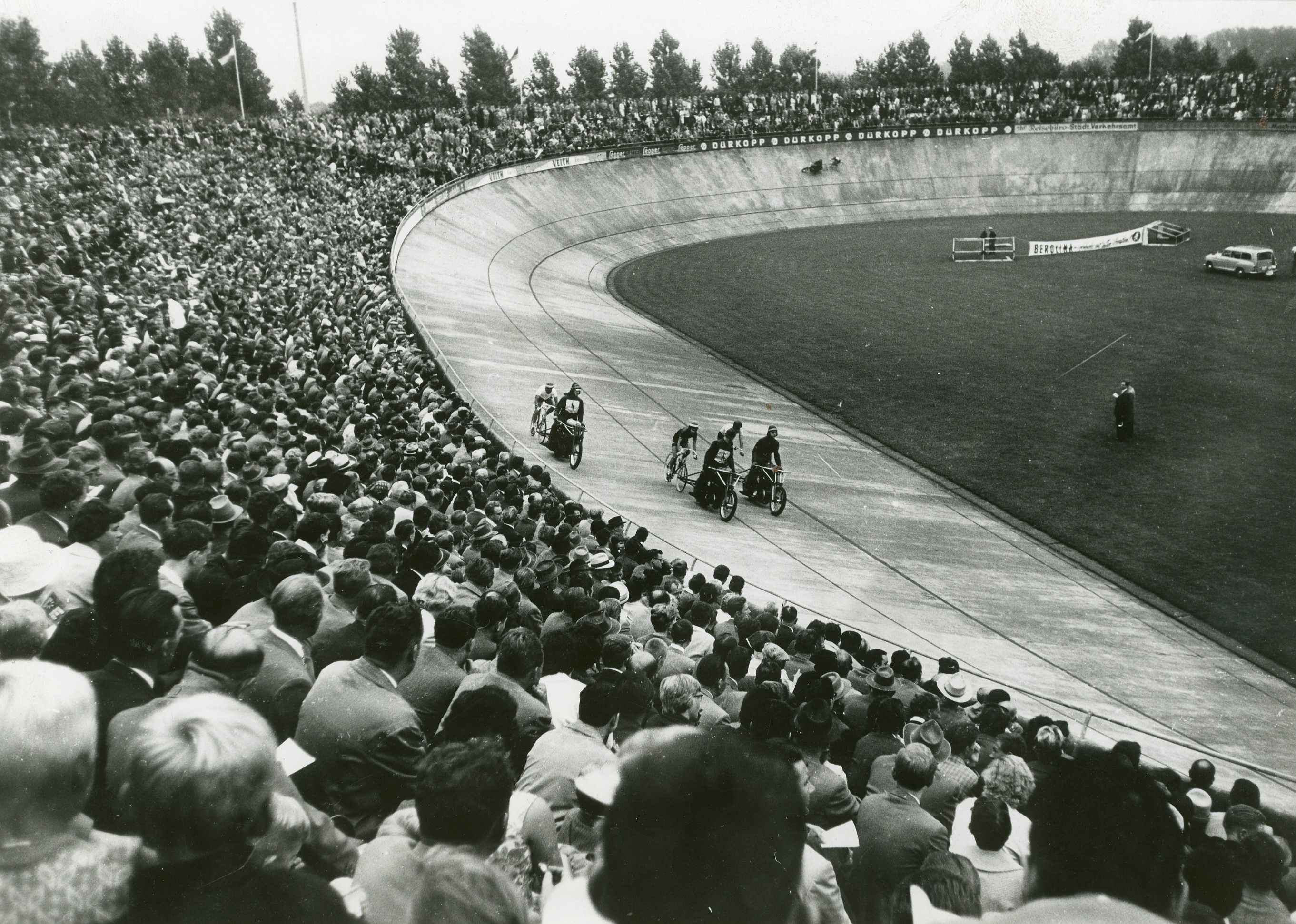 „Wir haben uns gestern davon überzeugen können, daß auf der etwa 12 000 qm großen, schlauchartigen links des Ovales der Radrennbahn alles o.k. ist. Es gibt keine Wassersorgen: Wasch- und Duschanlagen sind in guter Verfassung, dazu steht den Campingplatzbesuchern auch eine gute Geschirrspülanlage zur Verfügung. […] Die neue Masche: zwei Kästen mit je drei Möglichkeiten für elektrischen Stromanschluß”, schrieb am 24. Juni 1959 das Westfalen-Blatt kurz nach der Eröffnung des Campingplatzes. 5000 Personen sollte das Areal beherbergen können. Anziehen sollte der Platz vor allem Deutsche, Holländer und Dänen, so dass diese neue Einrichtung auch weit über Deutschland hinweg beworben wurde. Anzeigen erschienen im ADAC-Europa-Campingführer und auch in einschlägigen Nachschlagewerken in Dänemark und den Niederlanden. Anfang Januar 1959 hatte auch der Ausschuss für Leibesübungen der Stadt Bielefeld den Campingplatz für den Aufbau gestimmt. Aber schon zwei Jahre später bemängelte die Westfälische Zeitung am 30. März den schlechten Zustand, den sie gerade vorher noch so gelobt hatte. Für Männer und Frauen gab es keine getrennten Waschanlagen, nur sechs im Freien montierte Waschbecken, auch die Toiletten ließen wohl zu wünschen übrig. Eigentlich sollte das der große Wurf werden, die international genutzte Radrennbahn und in Verbindung damit direkt vor Ort vorhandene Unterkunftsmöglichkeiten. Aber der Plan ging nicht auf. 1966 konnte der Campingplatz nur noch rund 1700 Übernachtungen für das Jahr vorweisen. Die meisten davon steuerte das so genannte fahrende Volk bei, die Sinti und Roma, was in der Öffentlichkeit gar nicht gut ankam. Noch im selben Jahr wurde der Platz geschlossen.