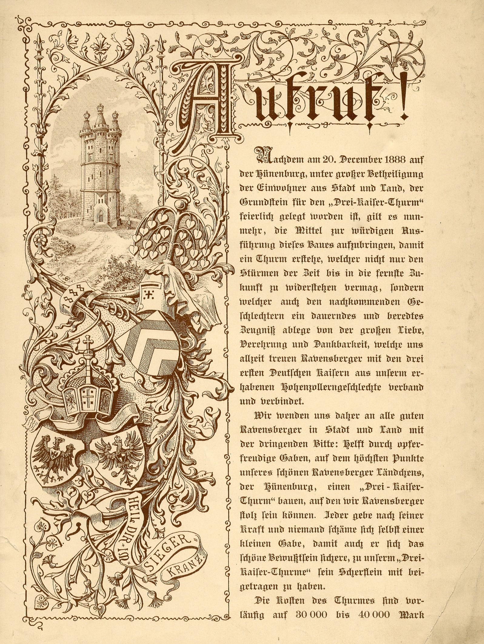 Für die Bürger, die sich am 20. Dezember 1888 trafen und den Grundstein für ein würdiges Denkmal legten, stellten sich diese Fragen nicht. Für sie war das Denkmal vielmehr ein „Merkstein” und ein „Denkstein für die nachkommenden Geschlechter bis in die entfernteste Zeit an die ewig denkwürdigen Ereignisse des Jahres 1888, in welchem nach Gottes unerforschlichen Rathschlusse nacheinander in Preußen drei Könige und in Deutschland drei Kaiser aus dem erlauchten Herrscher- und Heldengeschlechte der Hohenzollern regierten”. Sie wählten einen Vorstand, dem Landrat Franz von Ditfurth und Oberbürgermeister Gerhard Bunnemann (1842-1925) als sein Stellvertreter vorsaßen und fünf weitere Honoratioren aus der Stadt und dem Kreis Bielefeld angehörten, und beschlossen, „auf dem höchsten Punkte der alten Grafschaft Ravensberg”, der Hünenburg, den Dreikaiserturm zu bauen. Während das Gelände von der Besitzerin der Schenkwirtschaft Zweischlingen, Witwe Baumann, und von Meyer zu Borgsen kostenlos zur Verfügung gestellt wurde, sollte der Baufonds durch „freiwillige Beiträge der Eingesessenen des Stadtkreises und des Landkreises Bielefeld sowie der weiteren Umgebung” aufgefüllt werden.