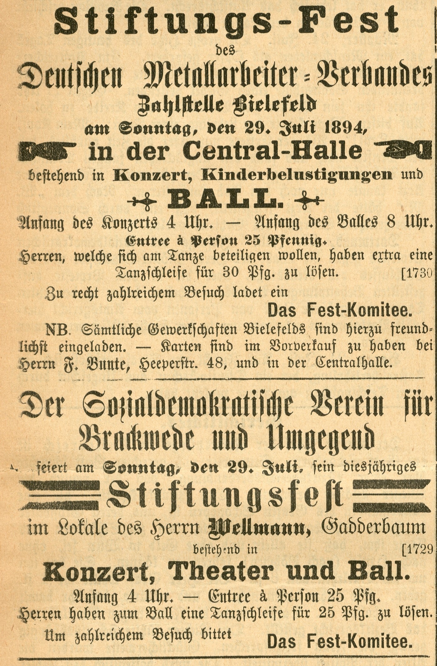 Selbstbewusst und kämpferisch verkündete die SPD, dass „die Arbeiter Bielefelds nichts mit Festen gemein haben wollen, welche von der Bourgeoisie, von den Vertretern der Geldherrschaft, eingerichtet werden.” Kaum vier Jahre nach der Aufhebung des „Gesetzes gegen die gemeingefährlichen Bestrebungen der Sozialdemokratie”, dem Sozialistengesetz, das 1878 verkündet und nach vier Verlängerungen 1890 aufgehoben wurde, hatte die Sozialdemokratie wahrlich keinen Grund, einem lebenden oder verstorbenen Kaiser zu huldigen. Als „Gegenstück zu der Patriotenfeier auf der Hünenburg” wurden gleich mehrere Veranstaltungen angekündigt. In der Centralhalle am Kesselbrink feierte der Metallarbeiterverband sein Stiftungsfest, für das mehr als 800 Eintrittskarten ausgegeben worden waren. Zudem hatte der „Sozialdemokratische Verein zu Brackwede” zu seinem Stiftungsfest im Wellmannschen Lokal in Gadderbaum eingeladen, das sich „eines sehr zahlreichen Zuspruches seitens der Arbeiterbevölkerung” erfreuen konnte. Auf beiden Festen stand mit Konzerten und Gesang, Theateraufführungen und Tanz die leichte Unterhaltung im Vordergrund.