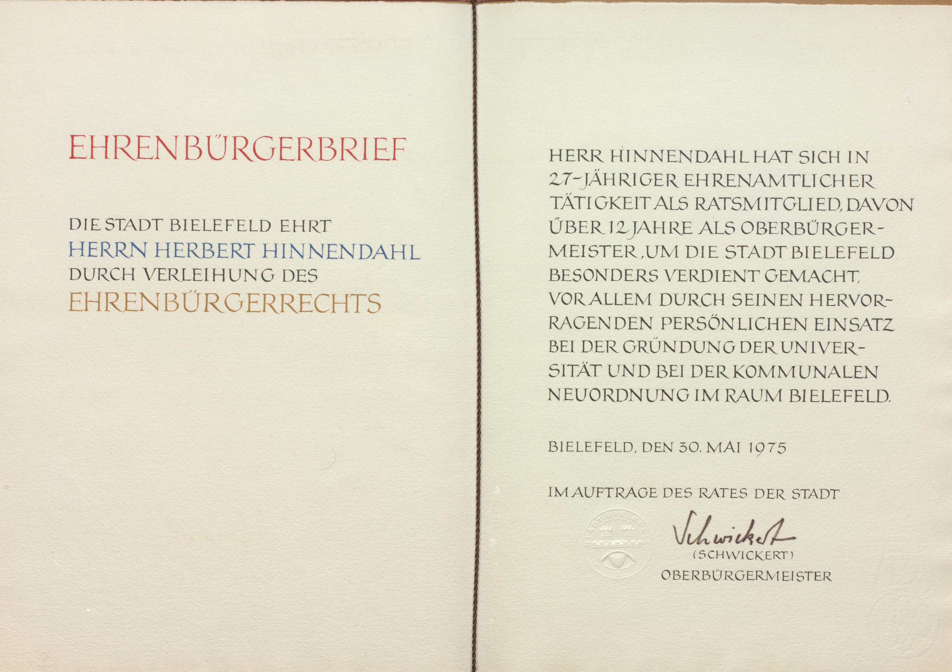 Die Lebenserfahrung, die Bildung und die Grundwerte im Umgang mit den Menschen, die Herbert Hinnendahl in sein Amt als Oberbürgermeister einbrachte, entstammten nicht einem akademischen Milieu, sondern waren seinem beruflichen und persönlichen Umfeld zu verdanken. Vor allem seine allerseits viel gepriesene Sparsamkeit und seine Fähigkeit zum pragmatischen Kompromiss mit dem politischen Gegner hatten wohl hier ihren Ursprung. „Streng aber gerecht” war eine Formulierung, mit der sowohl Weggefährten als auch politische Gegner Hinnendahl charakterisierten. Während Oberbürgermeister Artur Ladebeck (1891-1963), der die Nachkriegszeit in Bielefeld mit zwei Amtsperioden (1946-1952 und 1954-1961) prägte, primär die Beseitigung der immensen Kriegsschäden, das Schaffen von Wohnraum, den Wiederaufbau der Infrastruktur und das Unterbringen der Flüchtlinge zu bewältigen hatte, konnte Hinnendahl neben der Fortführung dieser Aufgaben den Blick auch auf die weitere Zukunft Bielefelds richten. Zusammen mit Oberstadtdirektor Heinz-Robert Kuhn (1909-1998) suchte Hinnendahl einen Weg, die Stadt von der niedergehenden Warenproduktion wegzuführen und zu einem Handels- und Dienstleistungszentrum in Ostwestfalen zu machen. Zwei Entwicklungen, die Hinnendahl mit Nachdruck und Engagement gefördert hat, haben maßgeblich dazu beigetragen, dass diese Vision umgesetzt werden konnte: Die Gründung der Universität, die am 17. November 1969 den Lehrbetrieb aufnahm, und die Kommunale Gebietsreform, die zum 1. Januar 1973 mit dem Zusammenschluss der Städte Bielefeld, Brackwede und Sennestadt sowie von 20 Ämtern und Gemeinden zur neuen Stadt Bielefeld als „Große Lösung”, wie sie Herbert Hinnendahl stets vehement verfochten hatte, abgeschlossen werden konnte. Es waren diese beiden langwierigen und zäh erkämpften politischen und strukturellen Großprojekte, die in der Urkunde zur Verleihung der Ehrenbürgerschaft an den scheidenden Oberbürgermeister Hinnendahl besondere Erwähnung fanden.
