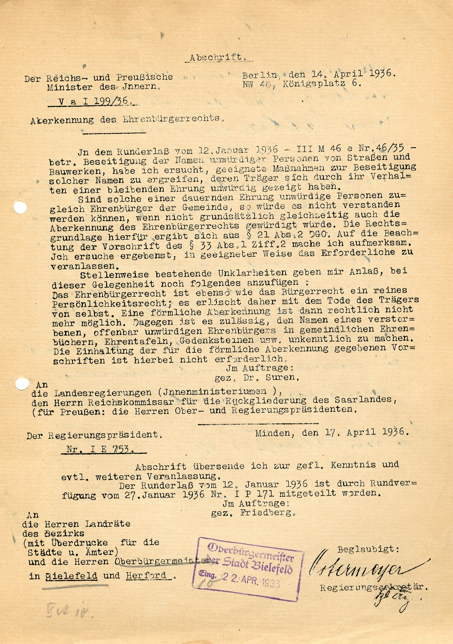 Grundlage für die Verleihung von Ehrenbürgerrechten ist die Gemeindeordnung (GO) für das Land Nordrhein-Westfalen. Nach § 34 der GO kann eine Gemeinde „Persönlichkeiten, die sich um sie besonders verdient gemacht haben”, das Ehrenbürgerrecht verleihen. Beschlüsse zur Verleihung aber auch zum Entzug des Ehrenbürgerrechts bedürfen dabei einer Mehrheit von zwei Dritteln der gesetzlichen Zahl der Ratsmitglieder. Vorschlagsberechtigt für die Verleihung sind die Fraktionen des Rates und der Oberbürgermeister. Die Nationalsozialisten versuchten mit verschiedenen Erlassen und Verordnungen die Verleihung von Ehrenbürgerrechten im ganzen Reich unter ihre Kontrolle zu bringen. Alle beabsichtigten Verleihungen der Ehrenbürgerwürde mussten laut Runderlass des Innenministeriums vom 26. Oktober 1933 vorab gemeldet und vom Preußischen Minister des Inneren genehmigt werden. Ausgenommen von dieser Regelung waren nur „der Reichspräsident, der Führer und Reichskanzler sowie der Ministerpräsident”. Ein weiterer Runderlass vom 9. Oktober 1940 verbot schließlich jede Verleihung des Ehrenbürgerrechts während der Dauer des Krieges. Auch Straßenbenennungen und –umbenennungen nach Offizieren und Soldaten, die im Krieg ausgezeichnet worden waren, sollten erst nach Beendigung des Krieges erfolgen. Schon 1936 versuchten die Nationalsozialisten durch einen Runderlass vom 12. Januar die Deutungs- und Bestimmungshoheit über vergangene Auszeichnungen zu gewinnen. Da eine förmliche Aberkennung des Ehrenbürgerrechts nach dem Tod des Geehrten rechtlich nicht mehr möglich sei, verlangte man, „den Namen eines verstorbenen, offenbar unwürdigen Ehrenbürgers in gemeindlichen Ehrenbüchern, Ehrentafeln, Gedenksteinen usw. unkenntlich zu machen”.