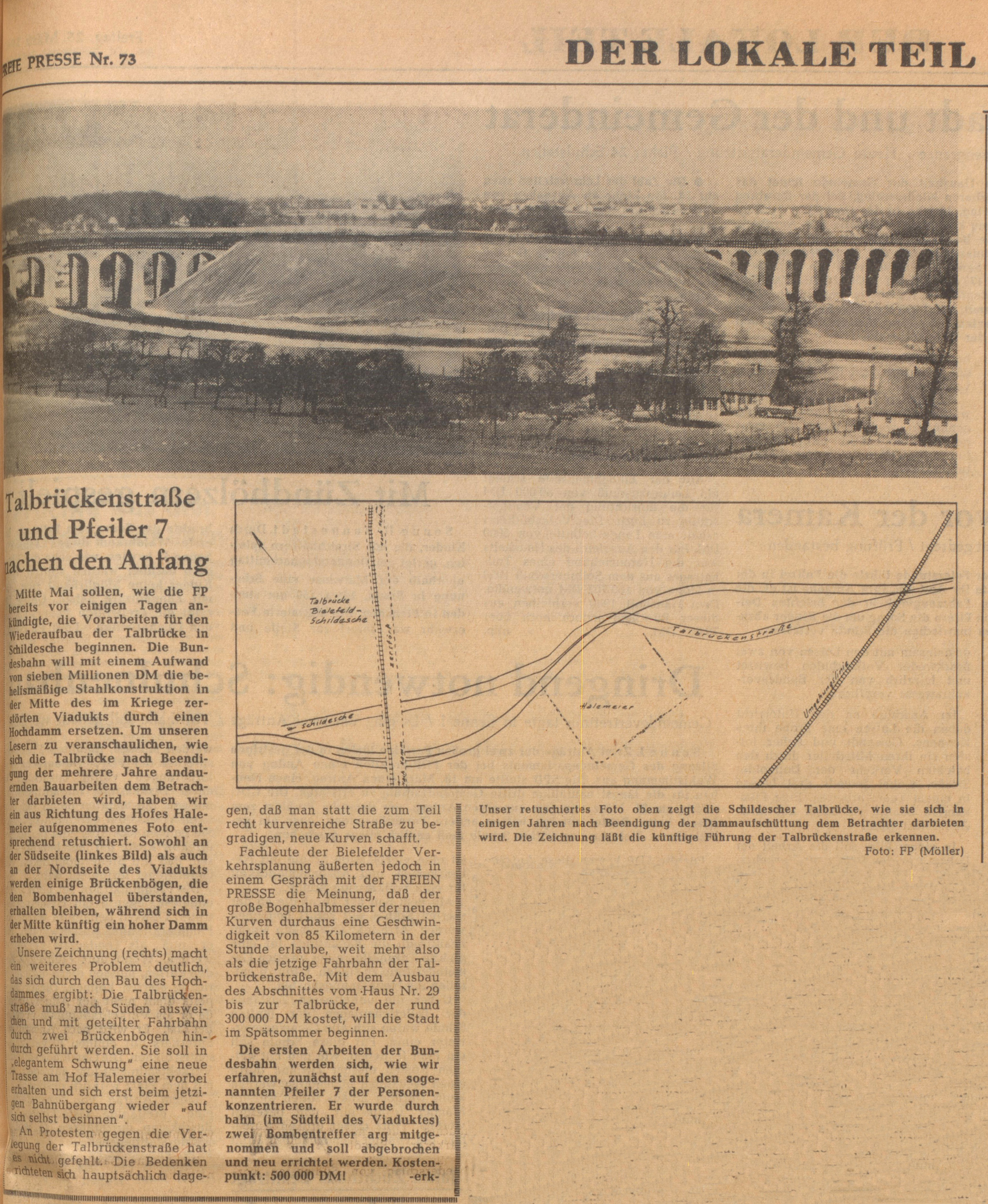 Acht Jahre später war die Umgehungsbahn immer noch in Betrieb und die Unterhaltungskosten alleine der Gleiskörper summierten sich auf 180.000 Mark jährlich. Doch nun nahm die Bundesbahn sich der Erneuerung des Streckenabschnittes beim Viadukt an. Als kostengünstigere Lösung gegenüber einem 8,5 Millionen D-Mark teuren Wiederaufbau der Brücke wurde der Bau eines Dammes zwischen den noch vorhandenen Brückenpfeilern vorgesehen, welcher mit Aufschüttungskosten von 2,3 Millionen D-Mark veranschlagt wurde. Dafür sollte die Talbrückenstraße verlegt werden. Die Stadt Bielefeld sprach sich gegen den Dammbau aus, da er das Landschaftsbild und den Erholungscharakter der Umgebung beeinträchtigen würde. Doch die Bahn beharrte aus Kostengründen weiter auf ihrer Dammlösung, schließlich würde der Wiederaufbau eines Viadukts 25 bis 30 Jahre dauern. Mitte Mai 1960 sollten die Arbeiten für den Dammbau beginnen. Was den Schildeschern vor ihrer Haustür blühen würde, demonstrierte die Freie Presse am 25. März 1960 in einer Fotomontage. Ein Damm der das Johannisbachtal teilt.