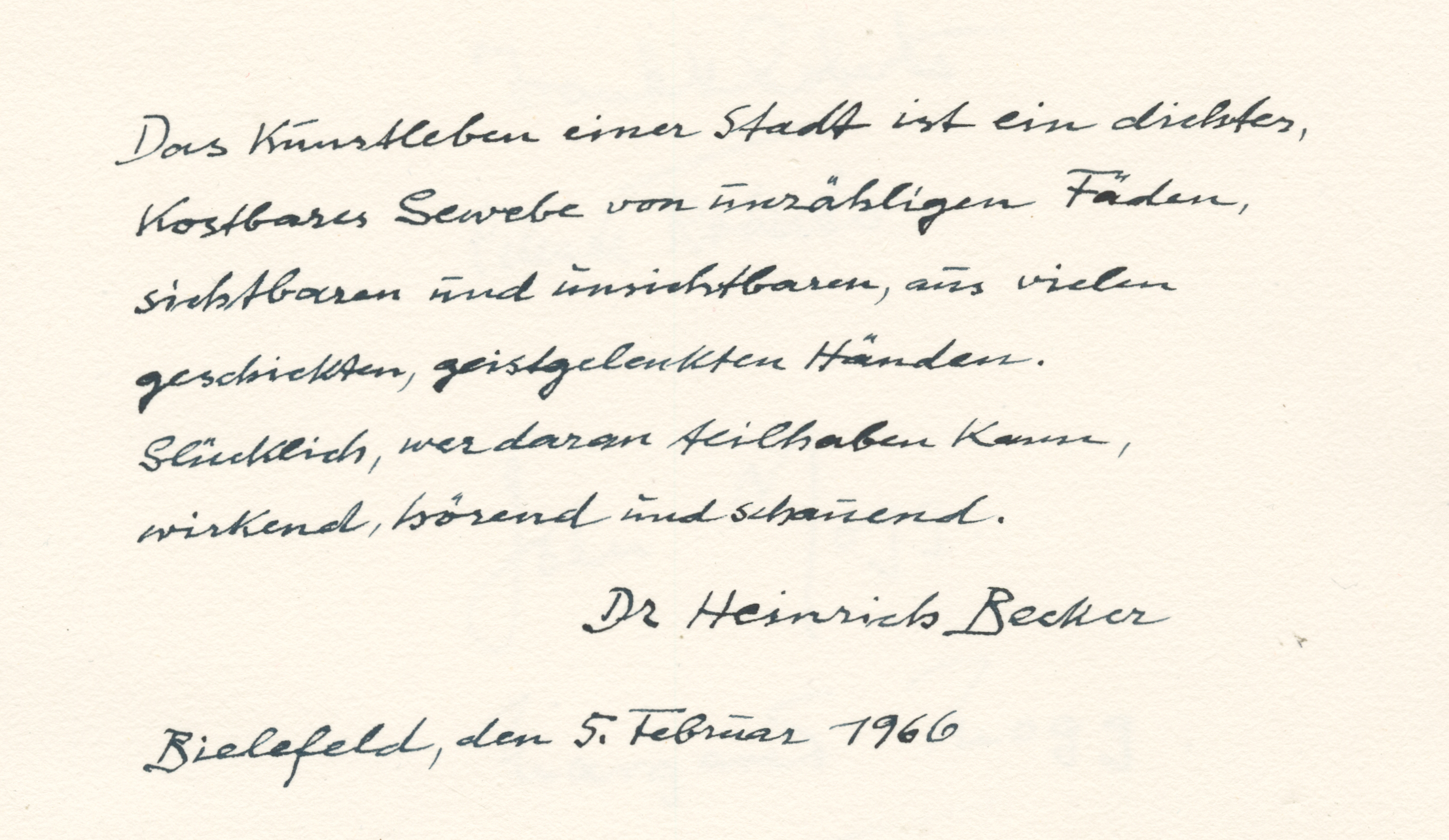 „Man sagt: Männer machen Geschichte. Dr. Heinrich Becker […] hat in Bielefeld Kunstgeschichte gemacht.“ Dieses Zitat aus der Westfälischen Zeitung vom 6. November 1961 beschreibt sehr treffend die Verdienste von Becker für die Stadt Bielefeld. Mit großem Eifer widmete er sich der modernen Kunst und legte die Grundsteine für das heutige Kunstleben. Trotz Rückschlägen während der Zeit des Nationalsozialismus hat er sein Bemühen nie aufgegeben. Und nicht nur der Bildenden Kunst war er zugetan, auch in anderen Bereichen engagierte er sich und leistete viel.