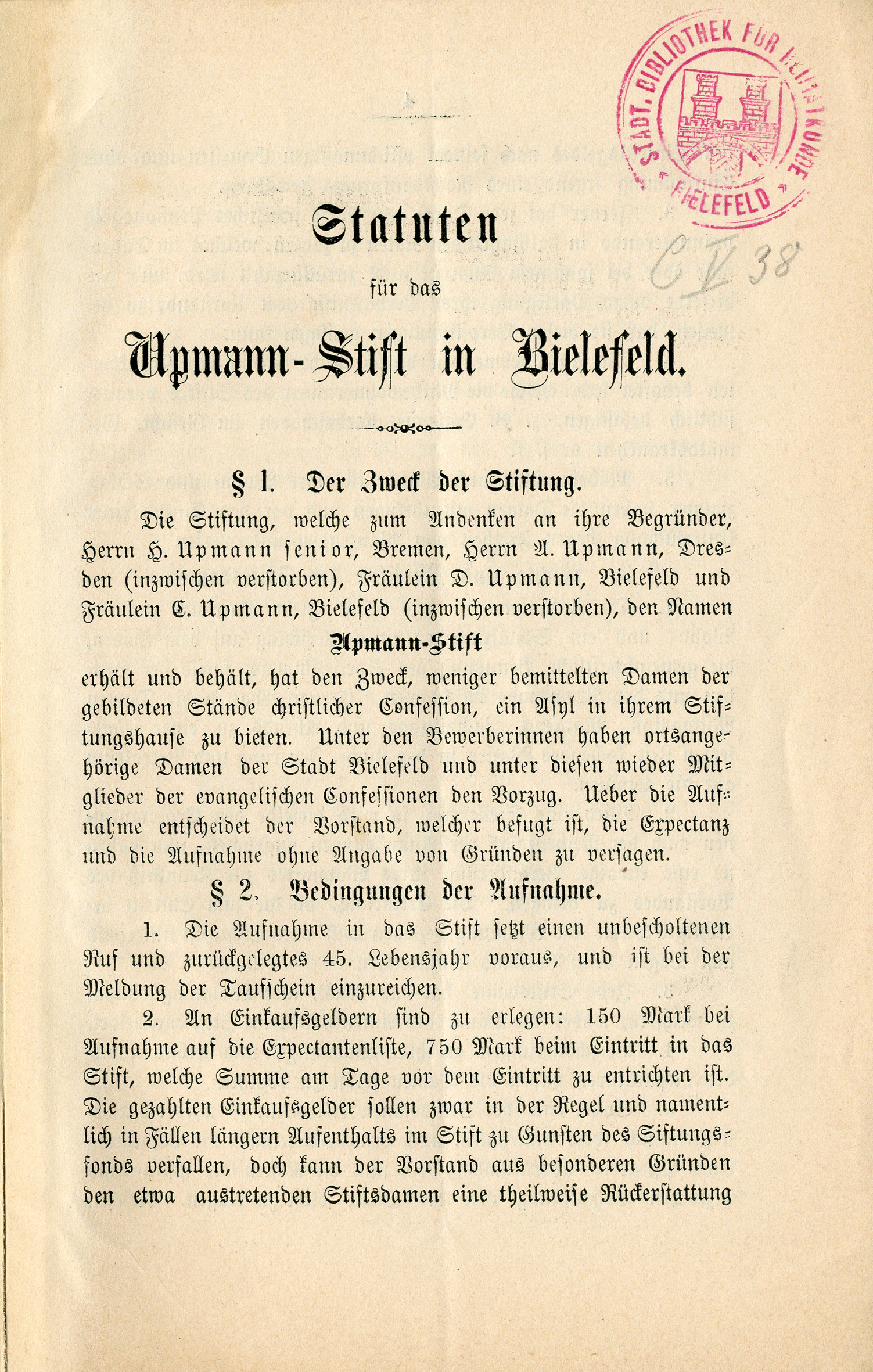 Im Juni 1882 stellte Hermann Upmann bei der Königlichen Regierung in Minden den Antrag auf Anerkennung des Upmannstiftes als juristische Person. „Die Familie Upmann, als deren Vertreter der unterzeichnete Kaufmann Hermann Upmann sen. zu Bremen handelt, hat zu Bielefeld unter dem Namen ‚Upmann-Stift‘ eine Versorgungsanstalt für ältere Damen errichtet und mit einem anmutig am Johannisberge gelegenen Gebäude nebst Garten sowie den sonst erforderlichen Fonds ausgestattet. […] Es ist aber mein Wunsch, die Zukunft der Stiftung und die Möglichkeit ihrer weiteren Ausdehnung über meine Lebenszeit hinaus sicherzustellen. – Ich beabsichtige zu diesem Zwecke, der Anstalt das bisher von ihr benutzte Grundstück zum Eigenthume zu übertragen und ihr ein Kapital zur Bestreitung ihrer sonstigen Bedürfnisse zu überweisen. – […].“ 100 000 Mark sollten reichen, um von den Zinsen den Fortbestand des Stiftes zu gewährleisten. Am 14. Januar 1884 wurde dem Antrag zugestimmt, und der Bielefelder Magistrat bestätigte die Übernahme in einem Schreiben vom 4. April 1884, unterzeichnet von Oberbürgermeister Gerhard Bunnemann (1842–1925). „[…] Wir nehmen hieraus gerne Veranlassung, Euer Wohlgeboren für die aus treuer Anhänglichkeit zur Vaterstadt, edlem Bürgersinn und christlicher Nächstenliebe hervorgegangene Gründung des Stiftes unsere hohe Anerkennung und unsern aufrichtigen Dank auszusprechen und daran die Versicherung zu knüpfen, daß wir allzeit bemüht sein werden, die Interessen des Stiftes zu fördern und den statutenmäßig uns obliegenden Pflichten zu genügen.“