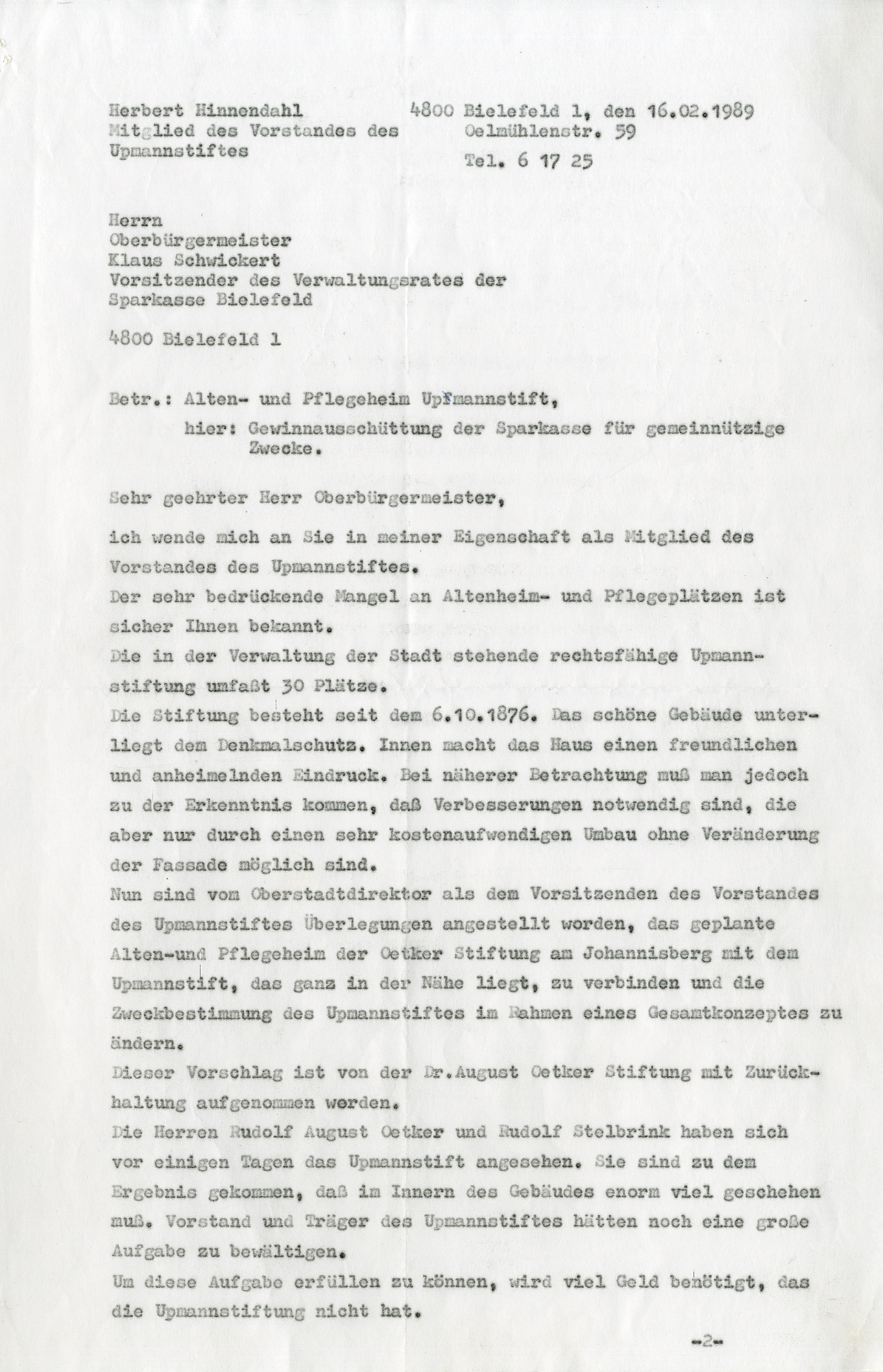 Zwei Jahre zuvor hatte die „Dr. August Oetker Stiftung“ beschlossen, zum 100-jährigen Bestehen der Firma 1991 ein Altenzentrum zu finanzieren. Der ehemalige Oberbürgermeister Herbert Hinnendahl (1914–1993), dem Upmannstift zugetan und der Sparkasse nahe, trat nach dem Bekanntwerden dieses Vorhabens gleich in Verhandlungsgespräche mit Rudolf und Maja Oetker, um sie für das Projekt „Upmannstift“ zu gewinnen. Anfänglich interessiert, war ihnen aber letztendlich das Zeitfenster zu eng. Parallel war ein anderes Altenzentrum in Ubbedissen-Lämershagen in Arbeit und in den Planungen weit fortgeschritten. Darauf fiel die Konzentration der Oetkerstiftung mit einer finanziellen Beteiligung von 1,2 Million DM. Schließlich eröffnete Oetker 1995 das stiftungseigene Caroline-Oetker-Stift auf dem Johannisberg, auf dem Grundstück, wo 1944 Richard Kaselowsky, Ida Kaselowsky (Oetker) und zwei weitere Familienmitglieder bei einem Bombenangriff umgekommen waren.