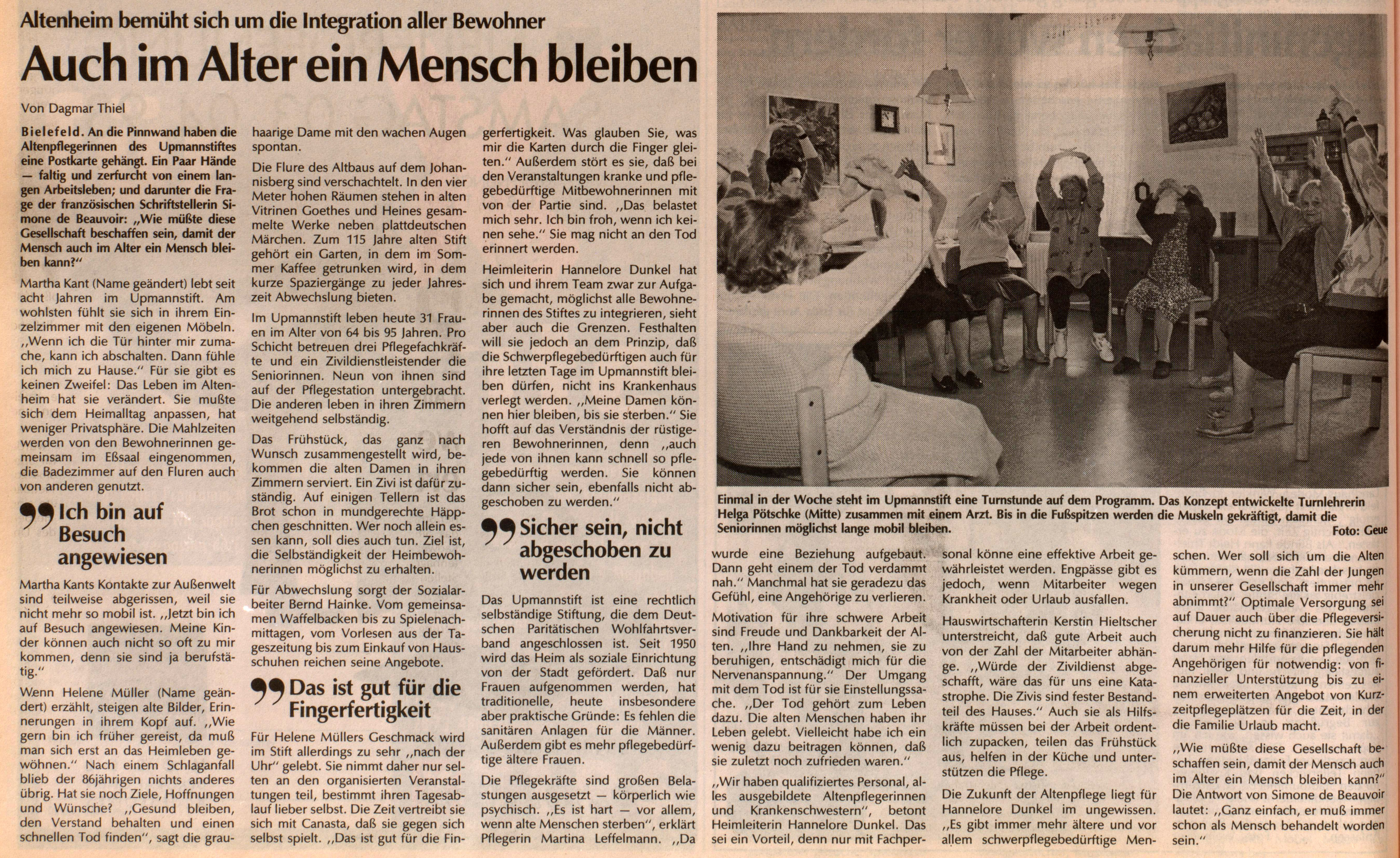 1990, auch die Frauenbewegung war im Blickfeld der Öffentlichkeit, versuchte man auf der politischen „Bühne“ beide Gruppierungen gegeneinander auszuspielen. Das Westfalenblatt vom 1. Juli fasste es in den ersten Zeilen seines Berichtes zur neuen Perspektive zur Kurzzeitpflege für alte Menschen wie folgt zusammen: „Pflegebetten statt Frauennachttaxi hieß, auf einen kurzen Nenner gebracht, vor zwei Jahren ein Vorstoß der CDU zugunsten der älteren Generation. 500 Plätze in Alten- und Pflegeheimen fehlten. Eine Million Mark sollte für ein Notprogramm im Sozialetat locker gemacht werden. Doch der Plan scheiterte: Grün-Bunte Liste und SPD blockten mit ihrer Ratsmehrheit alles ab. Seit sich das politische Blatt am 1. Oktober zugunsten der neuen bürgerlichen Mehrheit gewendet hat, sind CDU, Bürgergemeinschaft (BfB) und FDP gemeinsam in der Lage, auch in der Sozialpolitik neue Schwerpunkte zu setzten. Sie verankerten die Million nicht nur im Haushalt, sondern entwickelten auch das ‚Bielefelder Pflegemodell‘ mit Kurzzeit- und Tagespflege-Einrichtungen, familienentlastenden Pflegewohnungen und organisierter Nachbarschaftshilfe. Allen Unkenrufen zum Trotz fanden sich freie Träger bereit, Kurzzeitbetten in ihren Einrichtungen unterzubringen.“