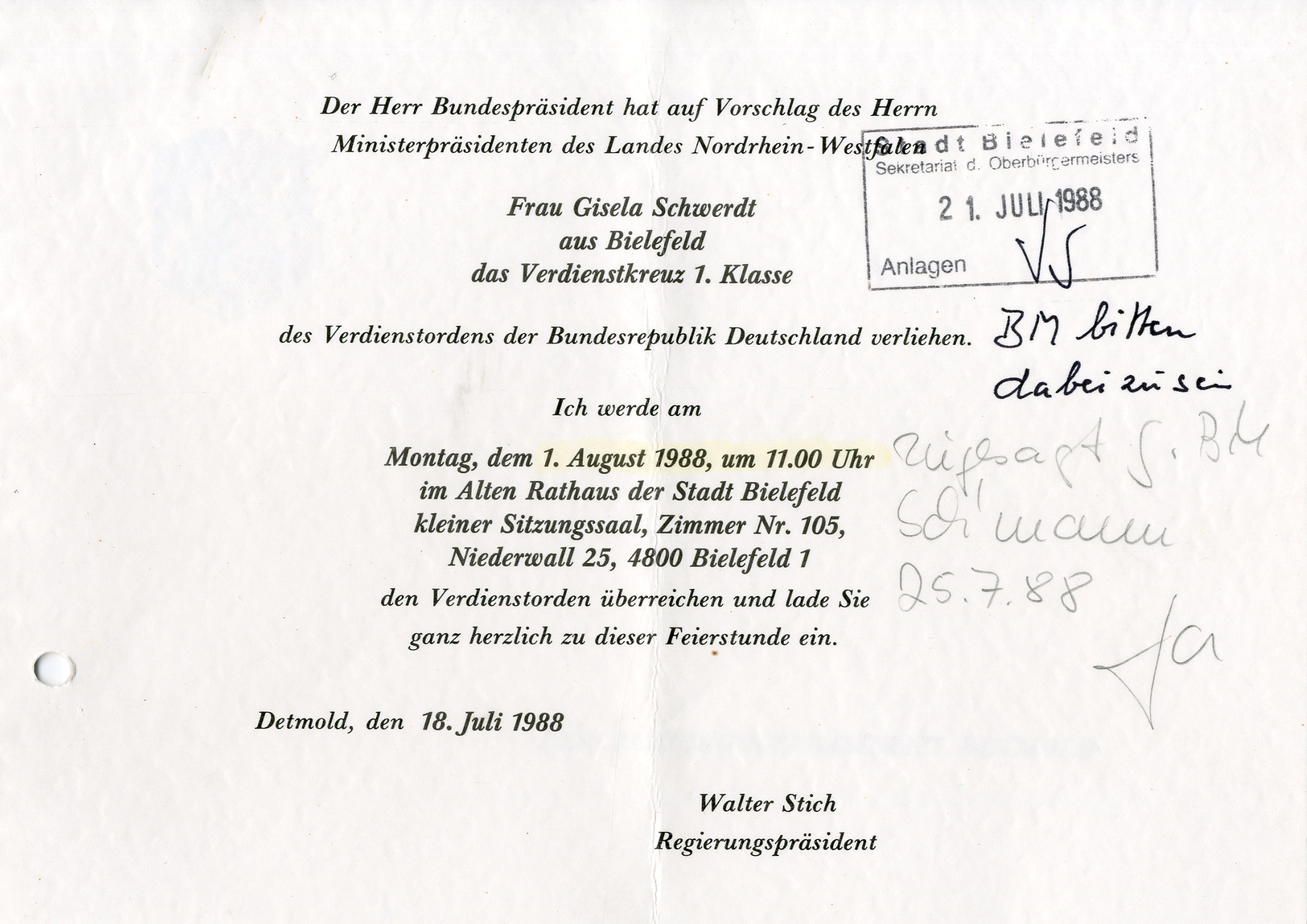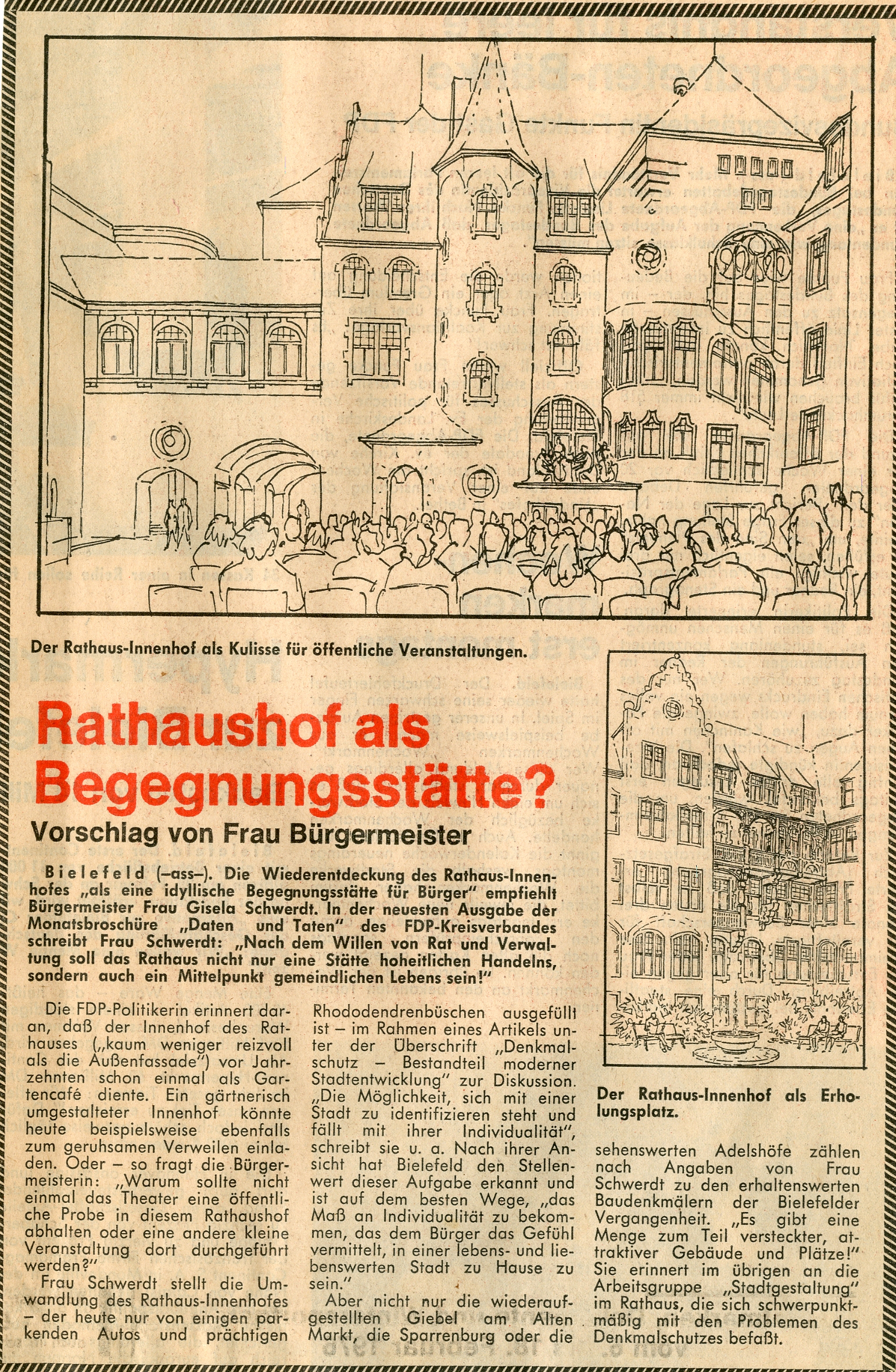 Zwei Jahre später, im Wahlkampf für die Kommunalwahl am 4. Mai 1975, schickte die FDP gleich zwei Frauen „in den Ring“. Zu dieser Zeit noch lange nicht selbstverständlich. Die eine war Gisela Schwerdt, die andere die Diplom-Soziologin Ruth Wienand (1921-2011). Auf Platz drei, vier und fünf folgten Hans-Jürgen Bartels, Wolfgang Höcker und Ernst Haushälter. In einem Pressegespräch, in dem erst ein kurzer Rückblick auf die letzten beiden Jahre seit der Zusammenlegung von Stadt und Kreis geworfen wurde, erläuterten beide Spitzenkandidatinnen detailliert zukünftige Aufgabenfelder, genannt seien an dieser Stelle u. a. vernachlässigte Ortsteile wie die Windflöte voranzubringen und die Nachnutzung des Flughafengeländes als Ort der Freizeitgestaltung. Eigens betonte Gisela Schwerdt, dass ihrer Partei die Erhaltung der „Eigentümlichkeit“ der Sennelandschaft und saubere Industrieansiedlungen am Herzen lägen. Gerade in der Industrie, wo der Frauenanteil besonders hoch sei, müssten die Kapazitäten von Halbtagsarbeitsplätzen erhöht werden, damit Frauen Beruf und Familie besser vereinbaren könnten. Ein Wunsch, der bis heute seine Gültigkeit nicht verloren hat. Zusammen mit ihrem Partei-Kollegen und Fraktionsvorsitzenden Joachim Schultz-Tornau hoffte sie, die Zahl der Fraktionsmitglieder von fünf auf sieben in dieser Wahl erhöhen zu können. Neben einem Sitz im Rat und ihrer Tätigkeit als Bürgermeisterin, war sie über Jahre ebenfalls gewähltes Mitglied in verschiedensten Ausschüssen, u. a. im Hauptausschuss, als Stellvertreterin im Finanzausschuss und im Planungsausschuss, dessen Vorsitzende sie war. Von 1986 bis 1989 war sie ebenfalls Vorsitzende der FDP-Ratsfraktion. 1977 ist sie als einzige Frau über den Vorstand des Städtetages Nordrhein-Westfalen nach einer Kampfabstimmung in den Hauptausschuss des Deutschen Städtetages gewählt worden und löste den Düsseldorfer Bürgermeister ab. Im selben Jahr konnte sie ihren 60. Geburtstag feiern. Die Gratulanten im Senner Hotel „Zur Spitze“ standen Schlange, nicht nur FDP-Gefährten und Freunde wollten dabei sein. Auch Regierungspräsident Ernst Graumann, Oberbürgermeister Klaus Schwickert, Oberstadtdirektor Herbert Krämer und auch Herbert Hinnendahl, Oberbürgermeister a.D., ließen es sich nicht nehmen, dabei zu sein. Alle hoben sowohl ihr politisches als auch soziales und kulturelles Engagement hervor, das weit über ein normales Maß hinausging. Sie war – wie man heute sagt – sehr gut vernetzt, so dass auch bürokratische Hürden kein Problem für sie waren.
