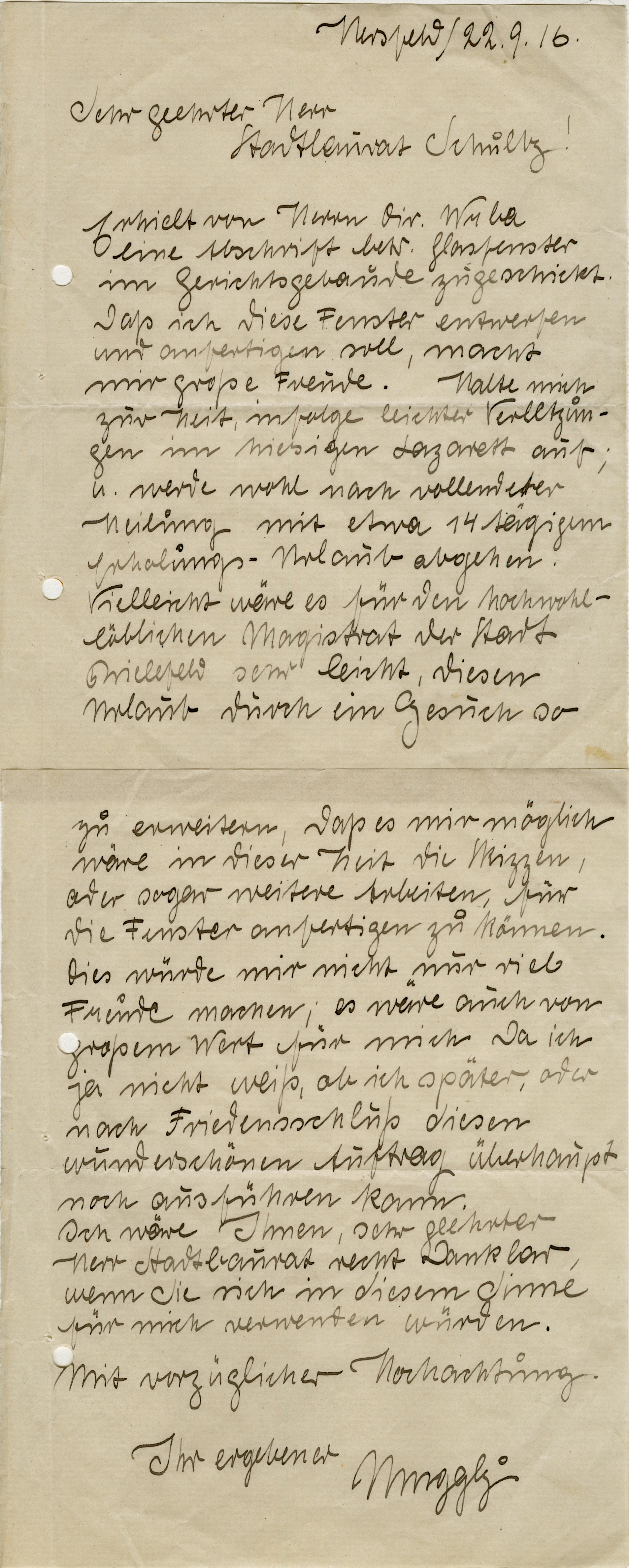 Am 31. August 1916 beschloss der Bielefelder Magistrat, den Gerichtsneubau am Obernwall/Ecke Detmolder Straße mit „Kunstverglase-Fenster in der großen Haupthalle“ auszugestalten und stellte dafür 3000 Mark zur Verfügung. Wieder war Stadtbaurat Friedrich Schulz damit beauftragt worden, einen geeigneten Künstler für das Projekt zu finden, was sich nicht ganz einfach gestaltete. Nachdem mehrere Künstler abgelehnt worden waren, kam Karl Muggly, der zu dieser Zeit kriegsverletzt im Lazarett in Hersfeld lag, „ins Spiel“. Er erhielt die Zusage und Schultz teilte dem Königlichen Bauamt für Gerichtsbauten am 9. September mit: „Der Magistrat beabsichtigt der Justizverwaltung zur Ausschmückung des Neubaus des Landgerichts die Bleiverglasung von 3 Hallenfenstern nach Entwürfen des Glasmalers Muggly zu schenken u[nd] die Fenster durch Muggly ausführen zu lassen. Um die Entwürfe vorbereiten zu können ersuchen wir um Übersendung je einer Zeichnung jedes Fensters im Maßstab 1:10 und eines Grundrisses der Halle. Die Sprossenteilung muß ersichtlich sein. Falls die hiesige Justizverwaltung oder das Bauamt besondere Wünsche in Bezug auf die darstellenden Motive hat bitten wir uns dies anzugeben, um Herrn Muggly entsprechende Anweisungen geben zu können.“ Im Zweiten Weltkrieg wurde auch das Landgericht, somit auch Mugglys Fenster, nicht von Bombenangriffen verschont. Erst 1951 erfolgte die Restaurierung.